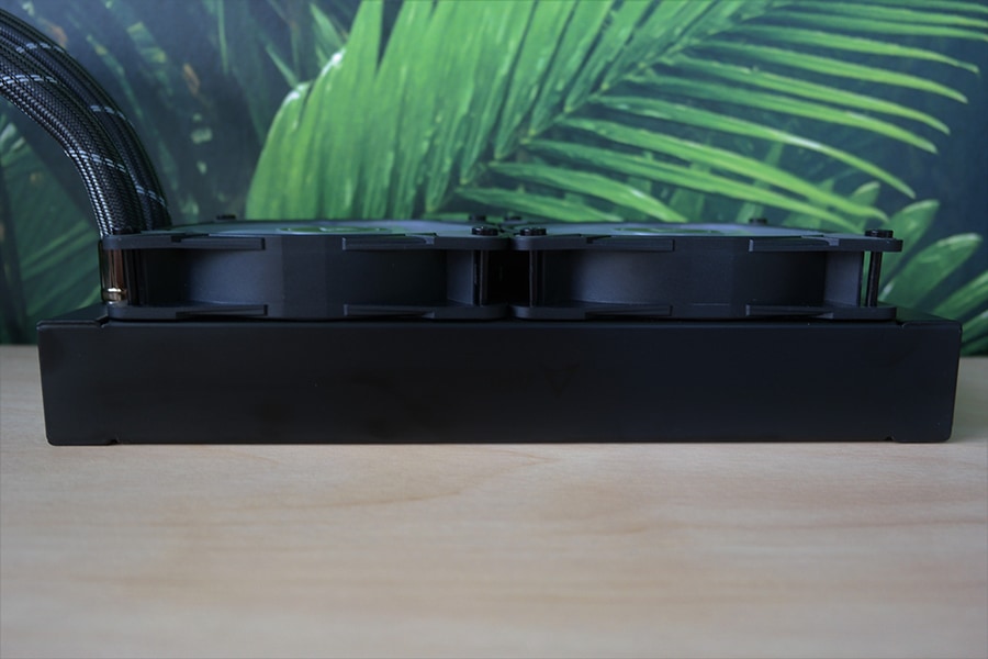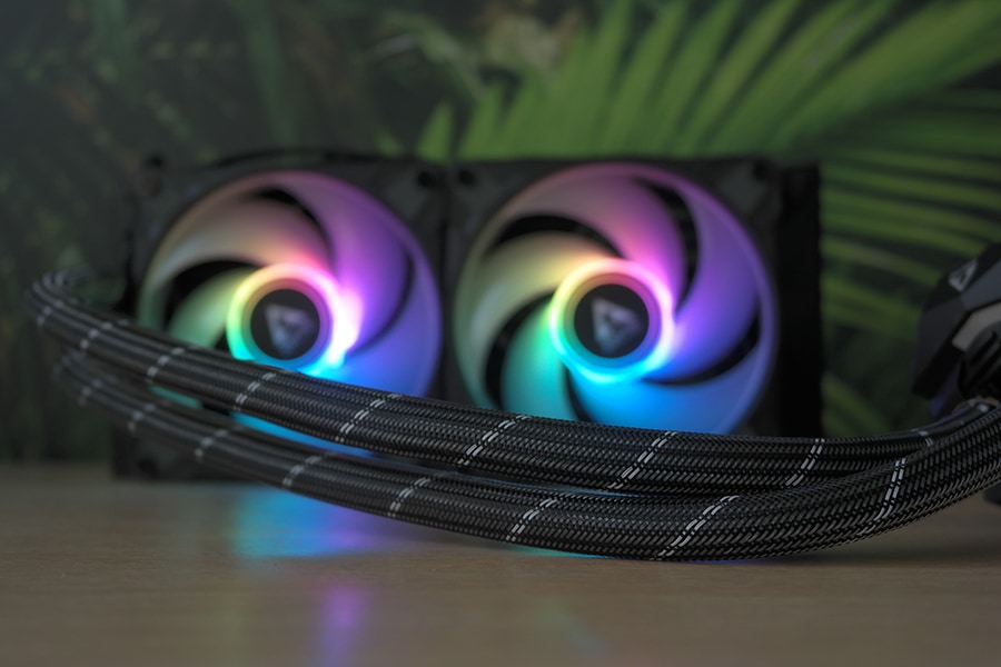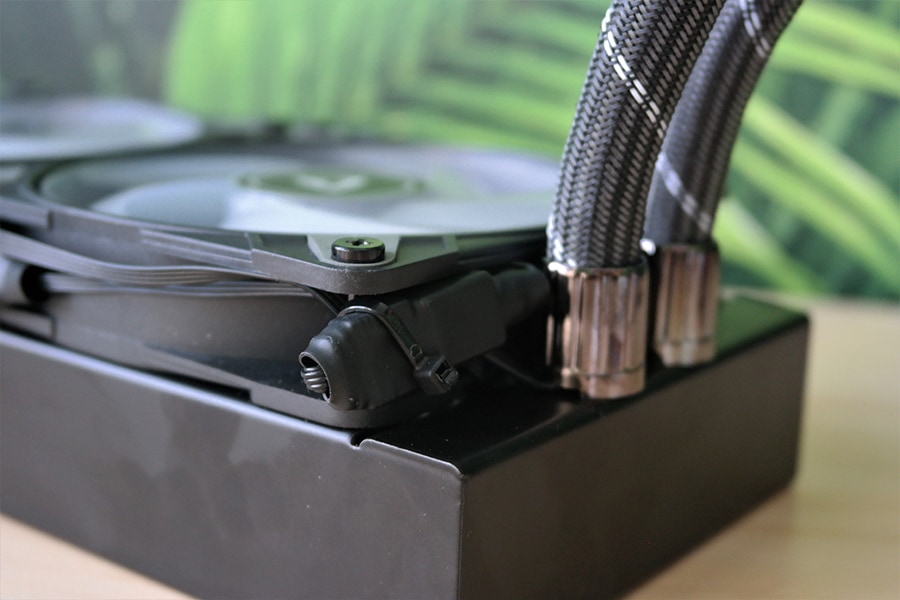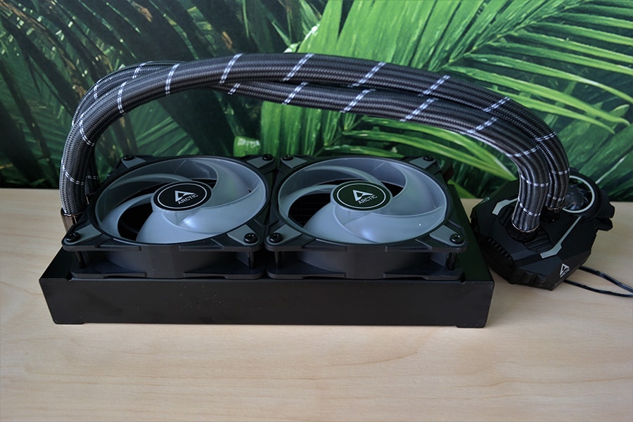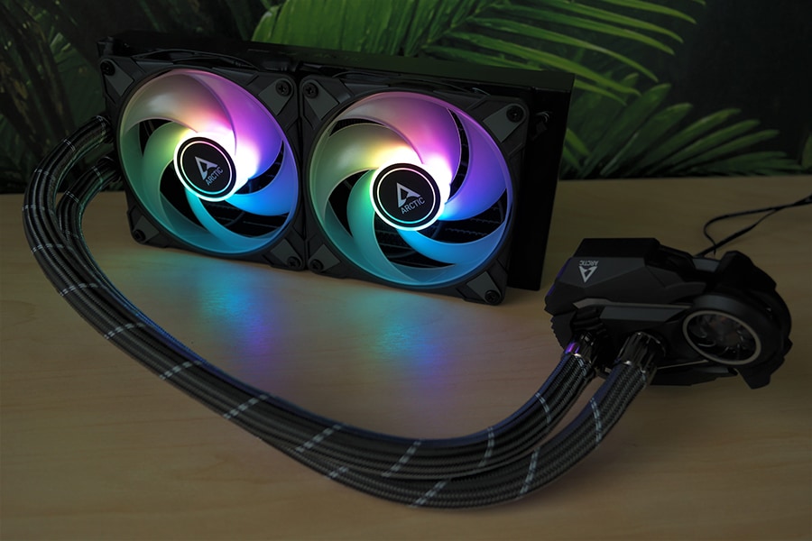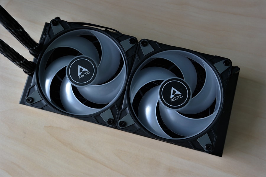 Ventilaatori puhul on tegu ARCTIC P12 PWM A-RGB, millest ka nimi vihjab, et tegu on 120 millimeetrilase ventilaatoriga. Ventilaator töötab vahemikus 200 kuni 1800 pööret minutis ja omab PWM ühendusega pesa. Lisaks on tugi adresseeritavatele RGB tulukeste kontrollile – tulukesi on ventilaatori keskosas kokku 12, kuna tegu on standardse ülesehitusega, siis kontrollimise tugi on olemas kõikidel emaplaatidel, kui on olemas vastav pesa. Ventilaatorid ise on võimelised tegelikult töötama 0 pöörde režiimis, kuid tulenevalt sellest, et ühe kaabliga toimub nii pumba kui ventilaatorite kontroll, siis puudub vastav funktsioon hetke olukorras.