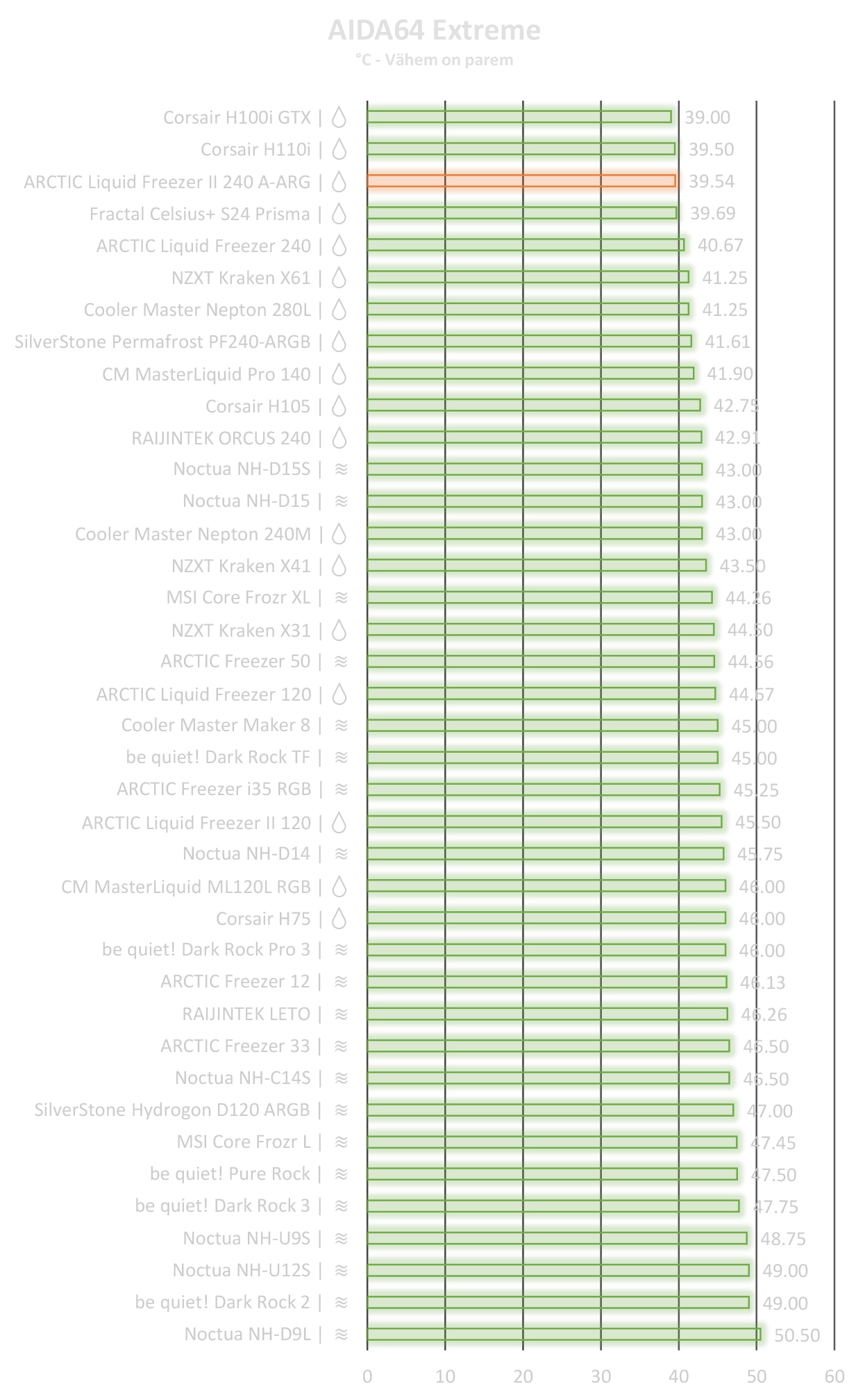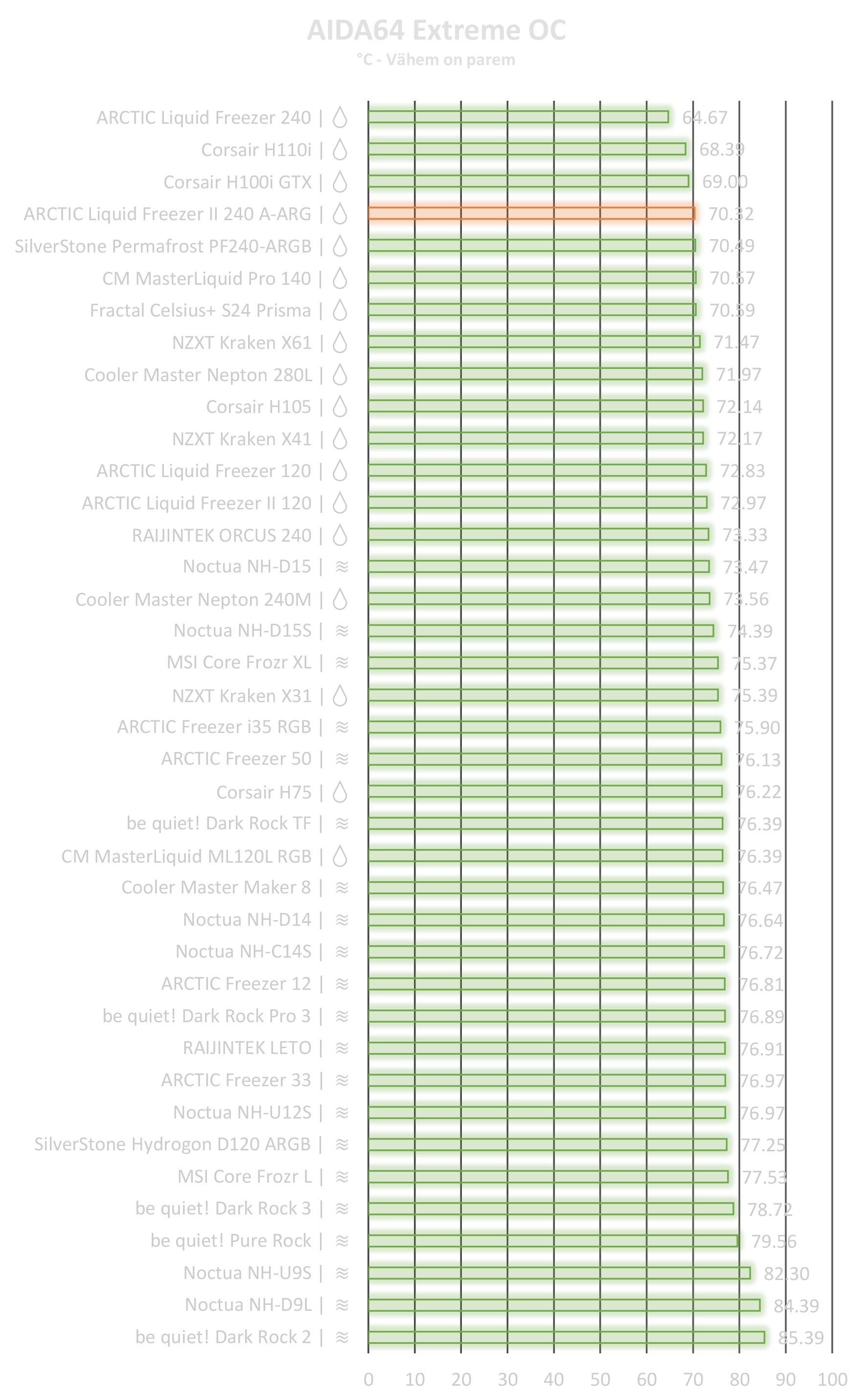 Jahuteid sai testitud AIDA64 EXTREME programmiga. Kõik jahutid olid seatud maksimaalse jahutuse peale, millega seoses siis ventilaator(id) või pump töötas täie võimsuse juures. Iga test kestis 30 minutit. Protsessori ülekiirendus oli seatud emaplaadi poolt automaatselt, milleks oli 4,4 GHz 1.285 V juures. Protsessorit oleks saanud veel kaugemale lükata, kuid otsustamise seada ohutu 4,4 GHz ülekiirenduse, mis OCCT programmi jaoks on 33,3% ülekiirendust. Testis osales kokku 39 jahutust (18 nendest olid kõik ühes vedelikjahutused ning 21 õhkjahutused), mis olid käeulatuses ja mida sai laenata. Toatemperatuur testimise käigus oli 22,5 kraadi. Mõõtmistulemused on korrektsed, kuid võib esineda mõõtmisvigu, seega võib võtta tulemusi kui pluss või miinus üks kraad saadud tulemuste suhtes. Jahutite puhul sai kasutatud ARCTIC MX-4 termopastat, et kõik oleks õiglane.