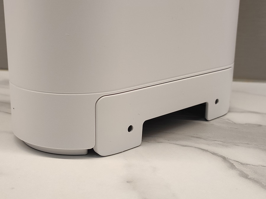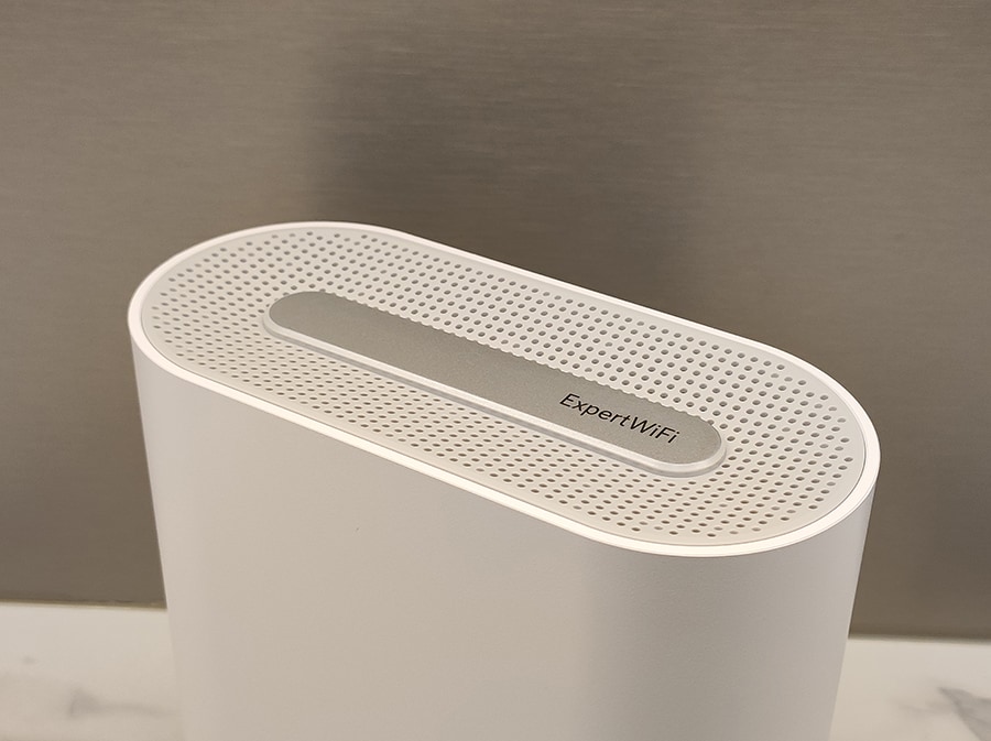 Alla on paigutatud suur kleebis, mis sisaldab teavet toote kohta, sisaldades üksikasju iga ExpertWiFi EBM68 poolt kasutatava vaikeseadena kasutatava WiFi-nime ja parooli kohta. Lisamugavuse huvides on olemas ka QR-kood, mis võimaldab automaatset WiFi-ühendust. Kaks kummijalga tagavad seadme stabiilsuse ja nende kõrval on olemas Reset-nupp ja WPS-nupp.