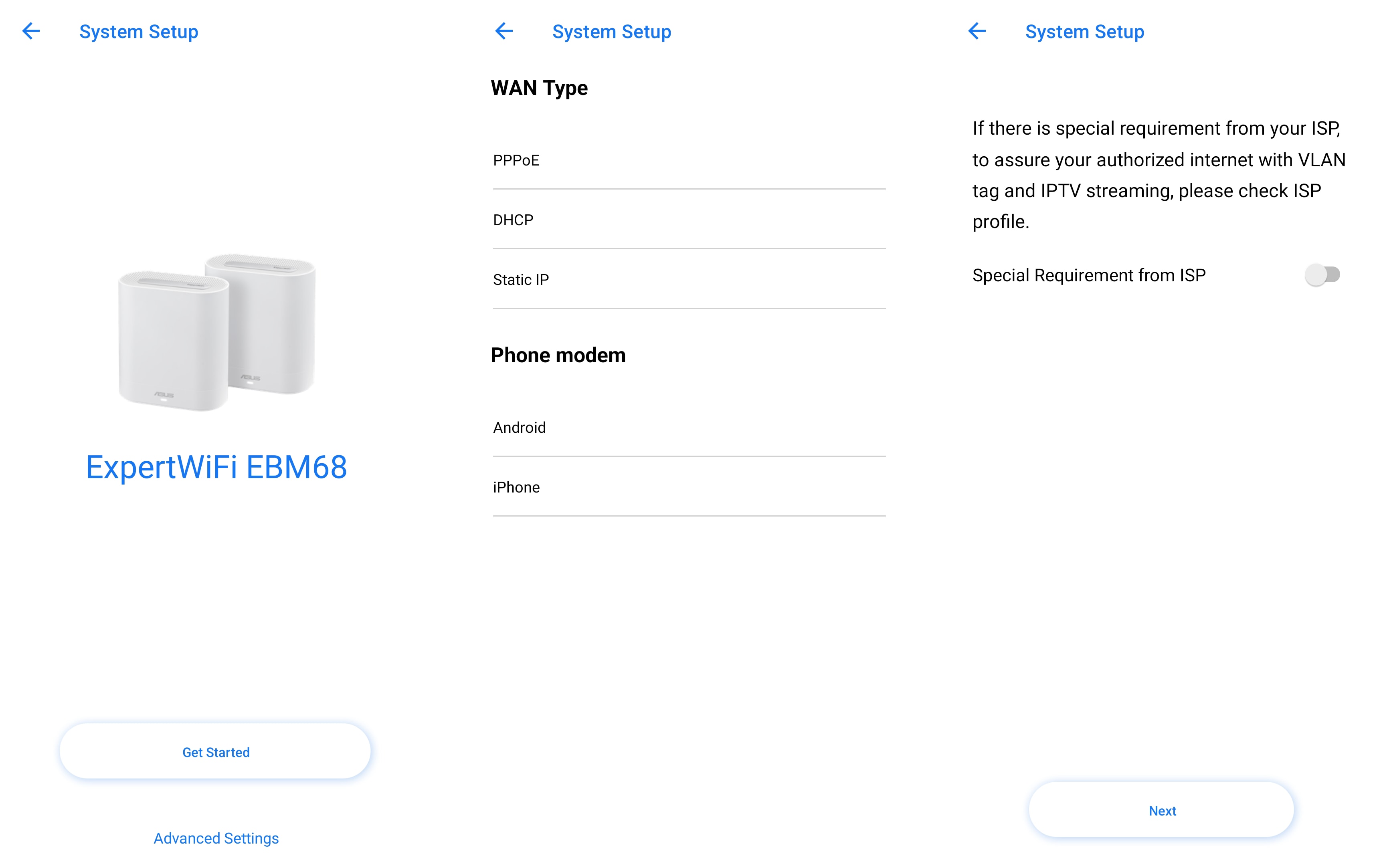 ExpertWiFi EBM68 seadistamine erineb traditsiooniliste kodukasutajatele mõeldud ruuterite ja ASUSe võrgusüsteemide seadistamisest. See erinevus tuleneb vajadusest paigaldada esmalt mobiilirakendus nimega ExpertWiFi. Rakendus on tasuta kättesaadav ning seda saab leida nii App Store'ist kui ka Google Play poest. Kõige kergem viis rakenduse leidmiseks oleks skaneerida põhiruuteril olevat QR koodi kleebist, mis viib kohe valitud rakenduse allalaadmislehele.