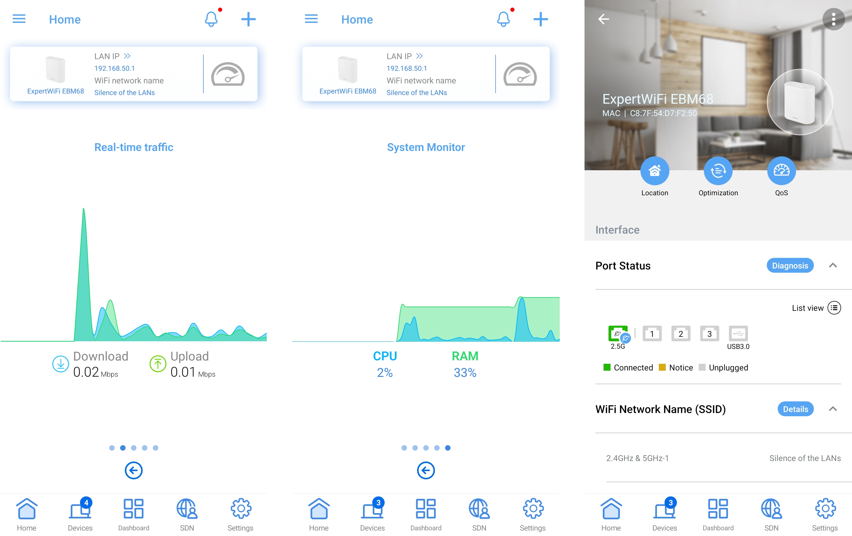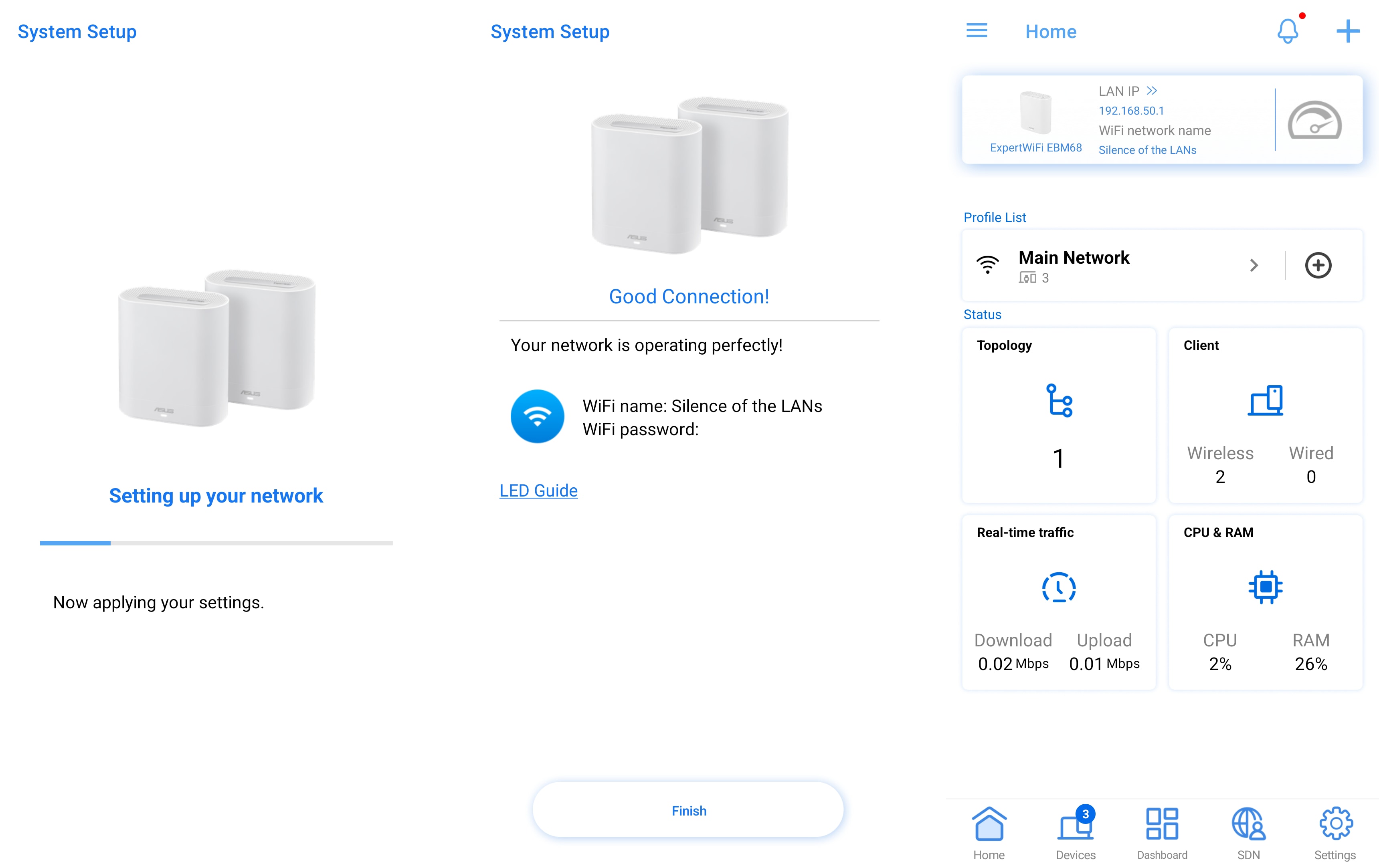 Paigalduse protsess on kasutajasõbralik ja esimesel paigaldamisel ei tohiks tekkida ühtegi probleemi. Lisaks saab alati hiljem seadistusi muuta. Märgatavalt erineb see rakendus kodukasutajatele mõeldud ASUSe Router rakendusest. Põhjus seisneb selle orientatsioonis äriliste kasutajate suunas ja nende konkreetsete nõuete täitmises. Seetõttu annab Avalehe vahekaart ülevaate võrgu olekust, reaalajas liiklusest ja ASUS ExpertWiFi EBM68 ressursikasutusest.