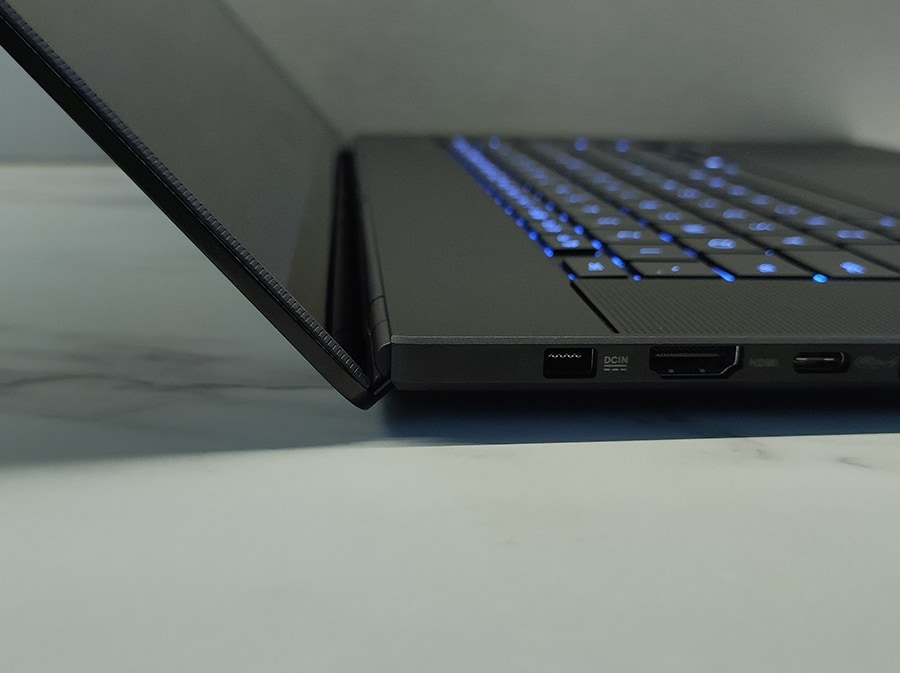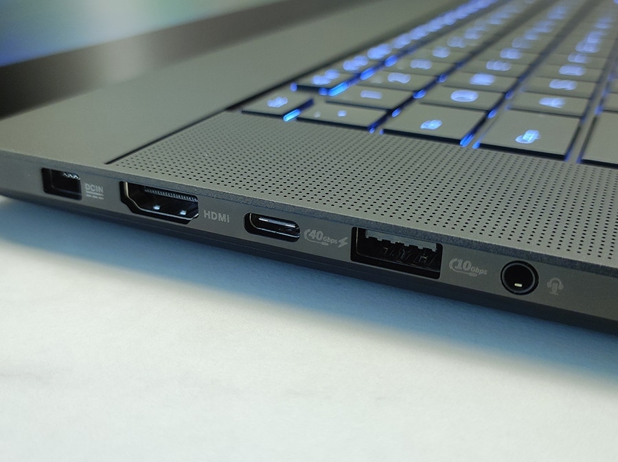 ASUS ProArt P16 vasakul küljel paikneb DC-in port, mis võimaldab ühendada 200 W toiteadapteri. HDMI 2.1 FRL port toetab kõrge eraldusvõimega väliseid ekraane, sealhulgas 4K @ 120Hz ja 8K @ 60Hz, mis on eriti kasulikud video- ja graafilise töö puhul. Lisaks on olemas USB 4.0 Gen 3 Type-C port, mis pakub kuni 40 Gbps andmeedastuskiirust ning toetab nii ekraani kui ka toite edastust. Lisaks on vasakul küljel USB 3.2 Gen 2 Type-A pordi, mille andmeedastuskiirus ulatub kuni 10 Gbps, ning 3,5 mm kombineeritud helisisend/väljund pordi, mis võimaldab ühendada kõrvaklappe ja/või mikrofoni.