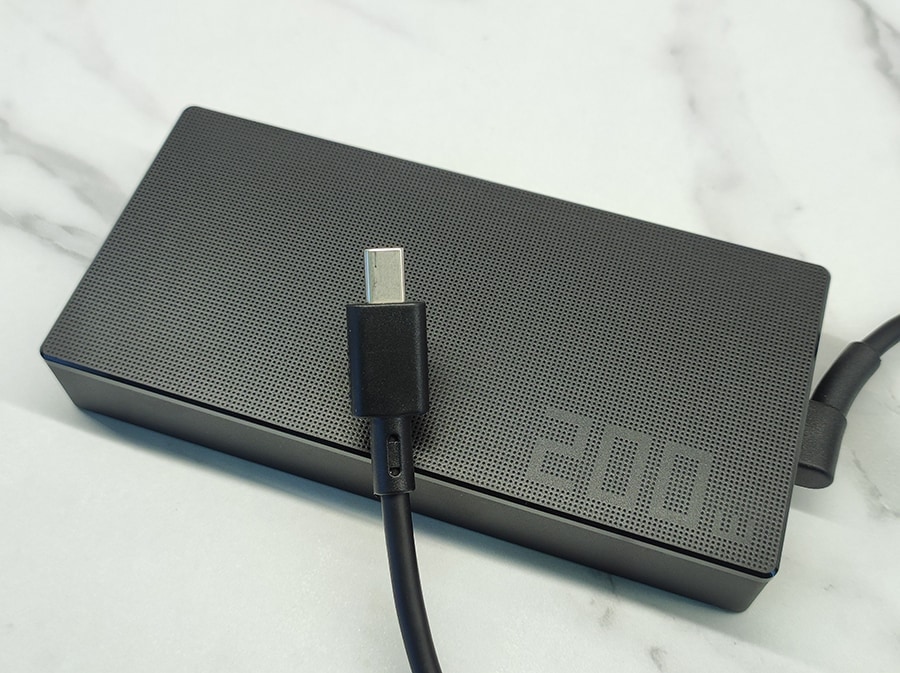 Laadimiseks kasutatakse 200 W laadijat. Lisaks toetab seade USB-C kaudu kuni 100 W laadimist, pakkudes paindlikkust ja võimalust kasutada väiksemaid, kaasaskantavamaid laadijaid näiteks liikvel olles.