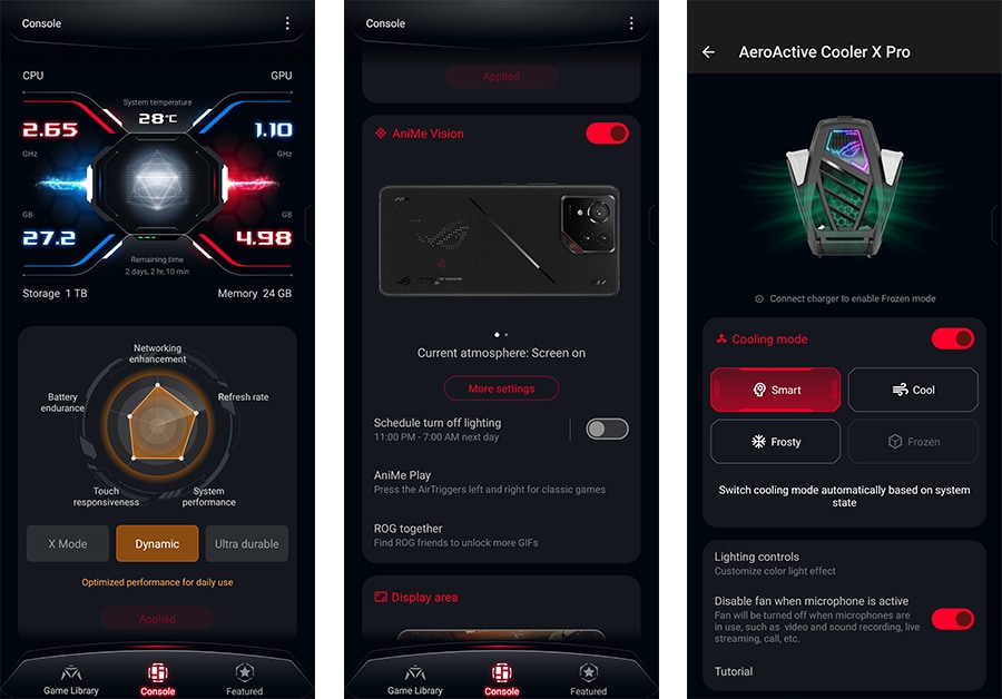 Seadme mängukeskuseks on Armory Crate rakendus, kus saab hallata mänguprofiile, seadistada RGB-valgustust ning kohandada tagumist mini-LED maatriks ekraani. Lisaks on ASUS integreerinud AI-põhiseid funktsioone, nagu reaalajas kõnede tõlge, AI-taustapildid ja pildiotsing galeriis.