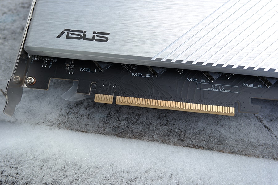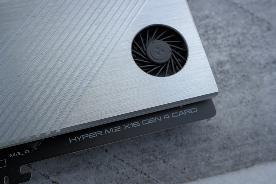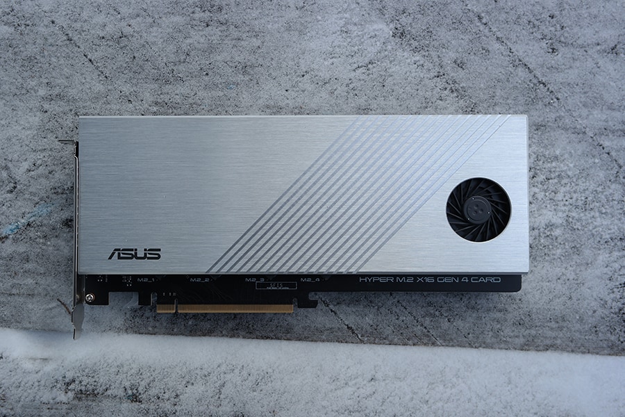 Ühe huvitava lisana on ASUS emaplaadiga kaasa pannud Hyper M.2 PCIe 4.0 laienduskaarti. Tegu on väga mõnusa lisaga, mis võimaldab seada M.2 SSD RAIDi kasutades kas maksimaalsele võimsusele või leida keskne piir kiiruse ja andmekadu vahel. Kui muidu on M.2 kettad enamasti paigutatud paralleelselt emaplaadiga, kas jahutus plokiga või ilma, siis Hyper laienduskaart kasutab jahutamiseks korpust ja tagab ka minimaalse õhuliikumise tänu väikesele ventilaatorile. Tänu korralikult PCIe ülesehitusele on võimalik kasutada graafikakaarti ja Hyper laienduskaarti mõlemat korraga PCIe 4.0 x8 ülesehituses.