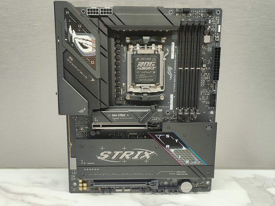 ASUS ROG Strix B850-F Gaming WiFi jätkab ROG Strix-seeria äratuntavat musta ja halli disaini, millele lisavad ilmet RGB-valgustusega ROG logo ning trükkplaadile integreeritud detailid. Disain on ühtlasi modernne, ent vaoshoitud, sobides hästi nii minimalistlikesse korpustesse kui ka silmatorkavatesse süsteemidesse.