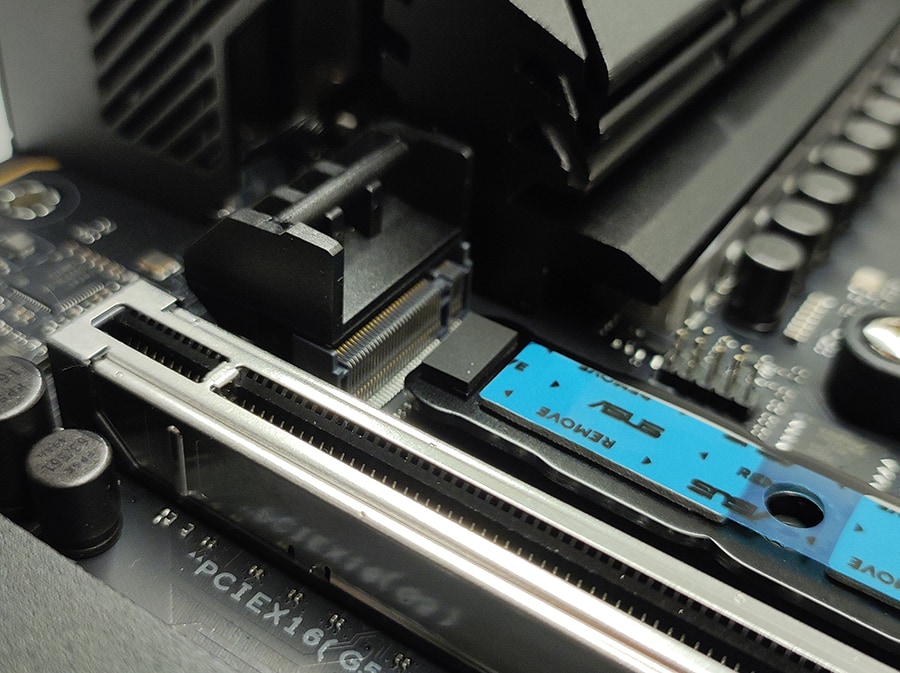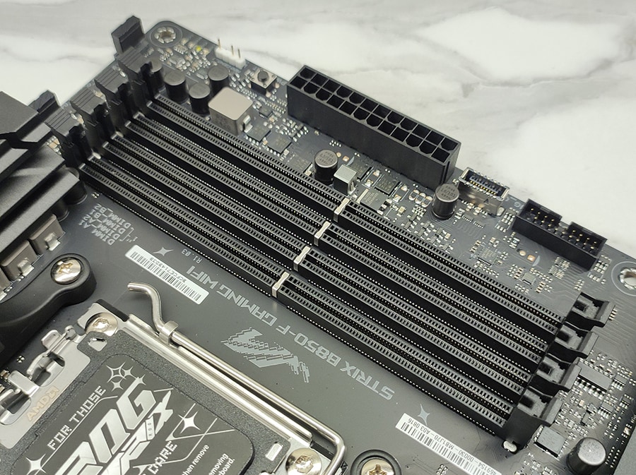 ASUS kasutab ka siin oma OptiMem II tehnoloogiat, mis parandab signaalide terviklikkust ja vähendab ebastabiilsusi eriti siis, kui kõik pesad on täidetud. Mälu pesad on korralikult märgistatud ning paigutatud piisava vahega, et suuremad protsessori jahutid või RGB-moodulid ei segaks paigaldust.