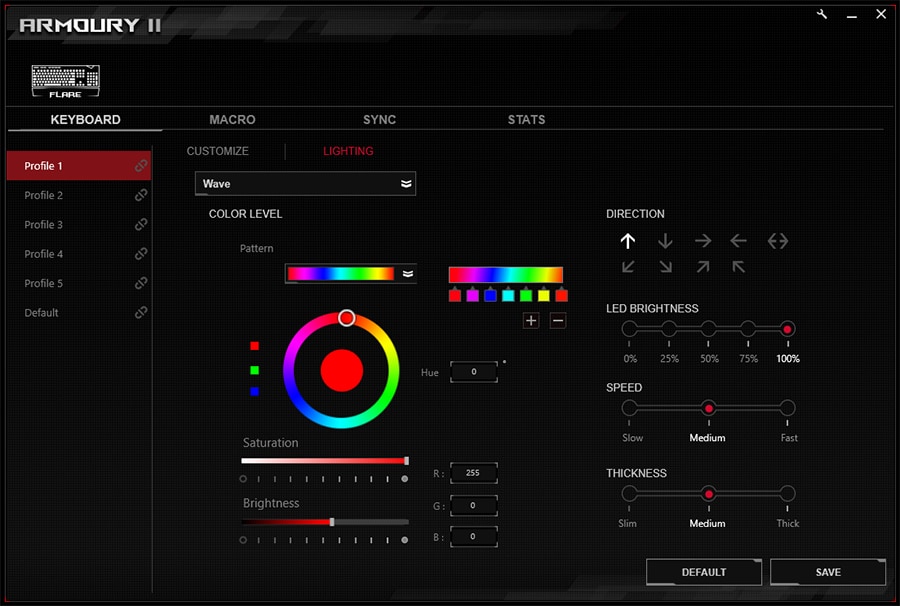 Armoury abil on võimalik valida kokku 11 erineva režiimi vahel, mis on isegi parem kui iCUE! Valikus on: wave, static, breathing, color cycle, reactive, ripple, starry night, quicksand, current, raindrop ning custom, kus kasutaja saab disainida omale meelepärase režiimi.