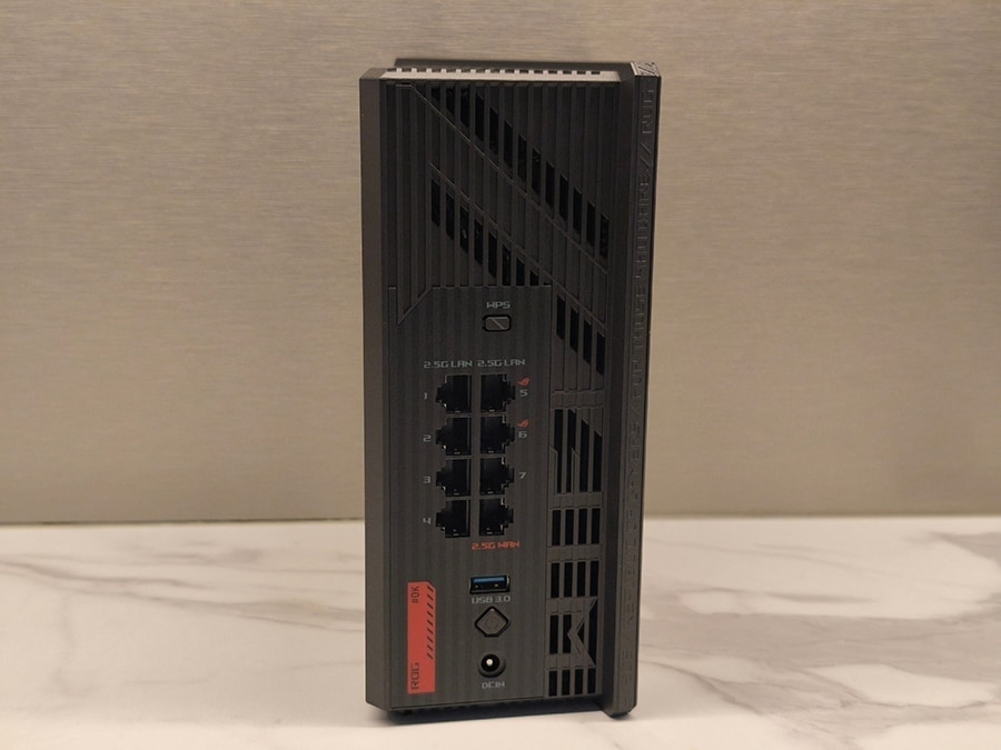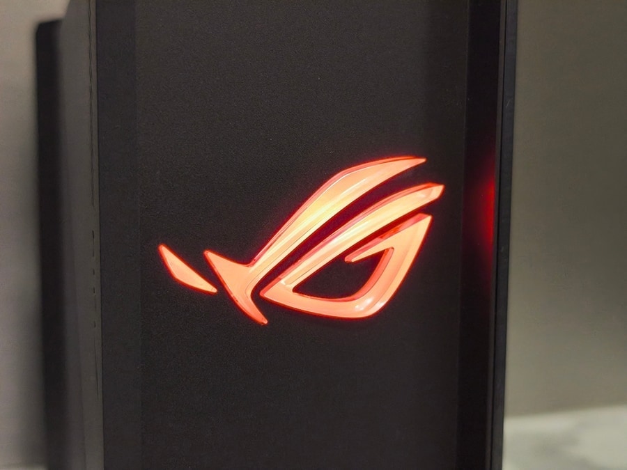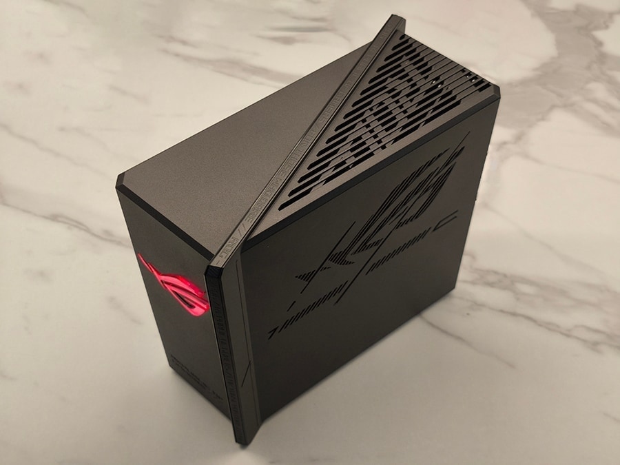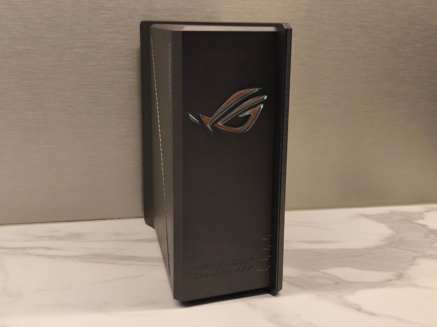 GS-BE18000 ei järgi traditsioonilist „lamedat musta putukat“ tüüpi mänguriruuterit. Selle asemel on mudel kompaktne vertikaalse ülesehitusega, mis on mõeldud silma jääma, ent mitte domineerima. Vertikaalne korpus aitab parandada õhuvoolu ja sisemiste antennide paigutust; kokku on neid kaheksa, millest kuus kasutavad signaali hõlbustamiseks vasktorusid. Korpusel on tagasihoidlik, kuid efektne ROG-logo valgustus ning üldmulje on premium-klassist, mida võib julgelt töö- või mängulauale nähtavale jätta. See on selgelt läbi mõeldud kombinatsioon funktsionaalsusest, jahutusest ja moodsast esteetikast.
