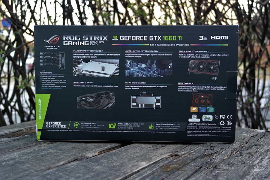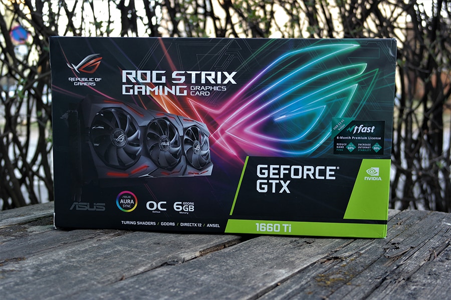 1660 Ti on pakendi poolest identne kõigi teiste ROG Strix seeria kaartidega. Pakendi esiosa on informatsionnitühi – leida võib vaid nime, kujutise kaardi alumisest osast ning WTFast kleepsu. Kõik Nvidia graafikakaardis on paigutatud mitmekordsesse pappkarpi ning on omakohta vahtplasti sees, et tagada maksimaalne turvalisus.