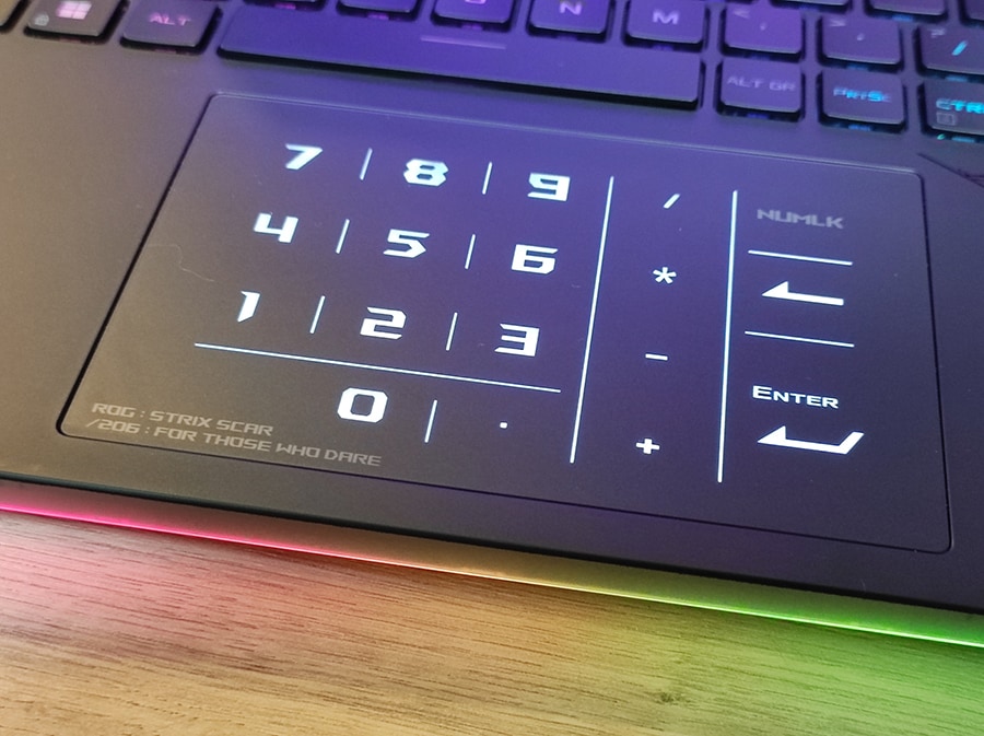 ROG Strix SCAR 16 on varustatud chiclet-klaviatuuriga, mis pakub meeldivat kirjutamistunnet tänu 1,9 mm klahvide liikumisele ja haptilisele tagasisidele. Klaviatuuri disain on mänguarvutitele omapärane, koos RGB valgustusega. Kõik klahvid on kujundatud täissuuruses klahvideks, mis tähendab, et paremal pool asuvad nooleklahvid on üsna tillukesed. Kiiretes olukordades võib siin kergesti vajutada valele klahvile, kui kasutaja on nooleklahvidega sinapeal. Tekstide kirjutamisel tuleb siiski harjuda lühendatud Shift-klahviga.