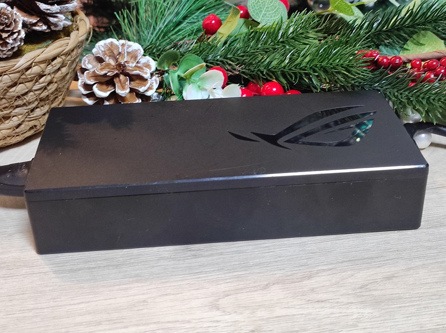 Mänguarvutiga tuleb kaasa 330-vatine toiteplokk ja mõned dokumendid. ASUS kasutab pakendi jaoks plastikut minimaalselt, ümbritsedes sülearvuti ainult kaitsekilega.