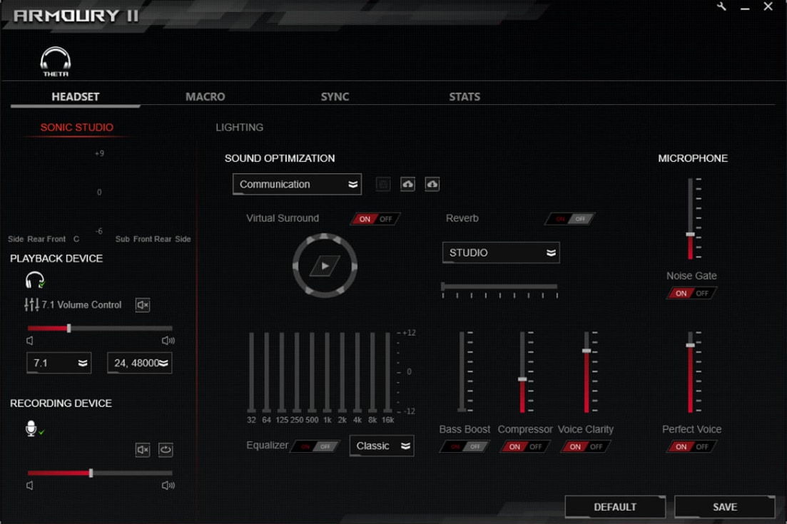 Theta toetab ASUSe arendatud programmi Armoury II, mis võimaldab muuta ekvalaiseri abil erinevaid heli seadeid, lisada juurde bassi, muuta mikrofoni heli selgust ja muuta ka surroudi sätteid.