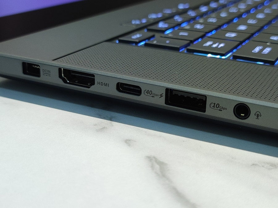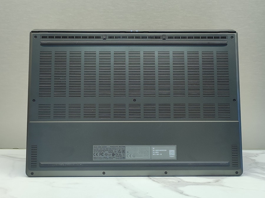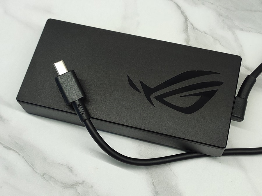 Seadme tagumine osa on täielikult pühendatud jahutusele, mis nõuab pordiühenduste jaotamist sülearvuti mõlemale küljele. ASUS on kasutanud uut nelinurkset toitepistikupesa, mis asub korpuse vasakus tagaosas. Seade hõlmab kõiki olulisi ühendusi - vasakul küljel on toitepistik, HDMI 2.1, USB-C 4.0 (40 Gbit/s, DisplayPort 2.1, toiteülekanne) ja USB-A 3.2 Gen 2 (10 Gbit/s).