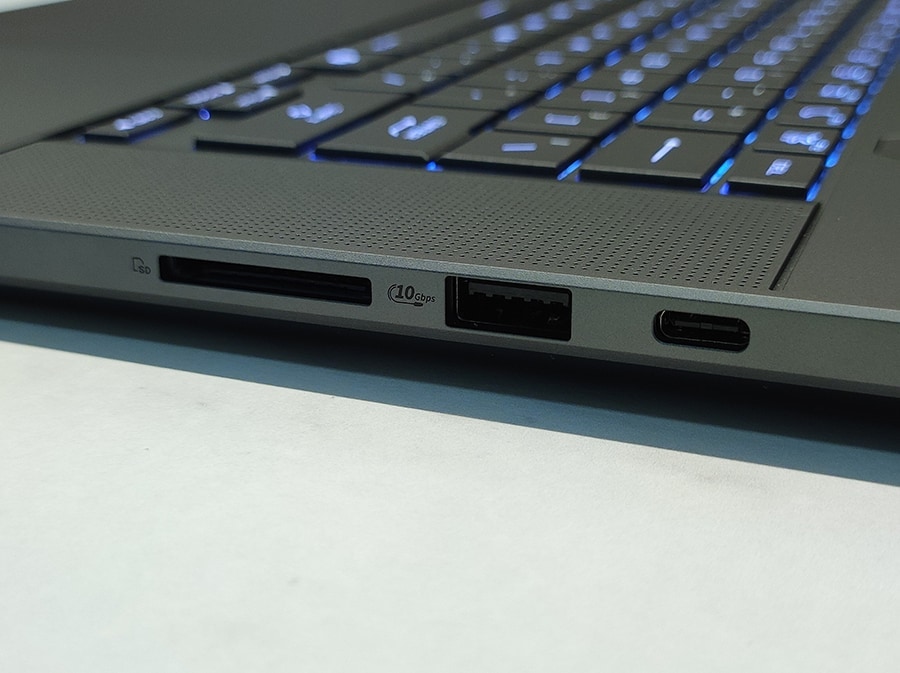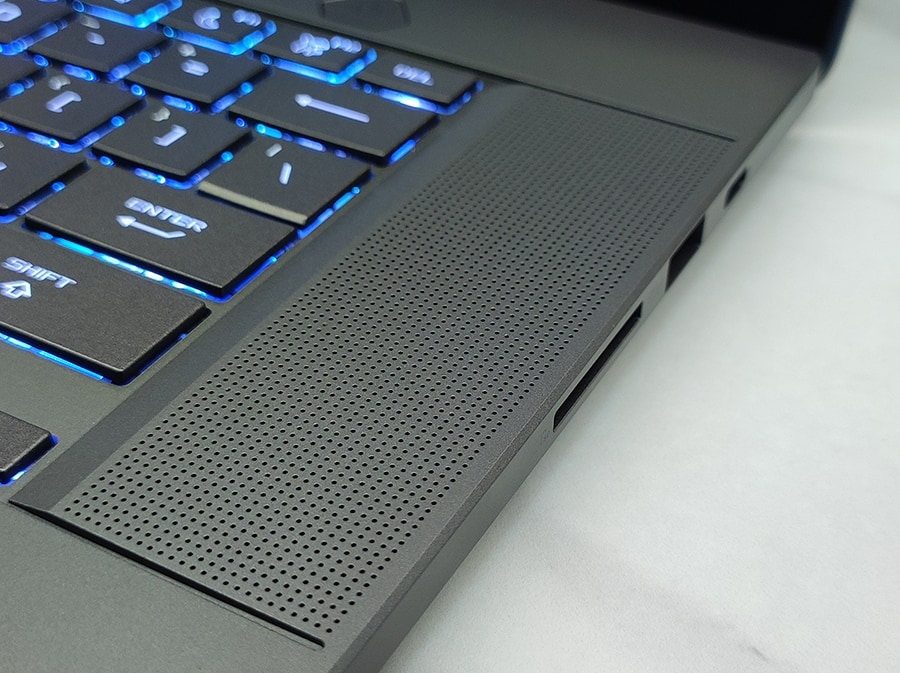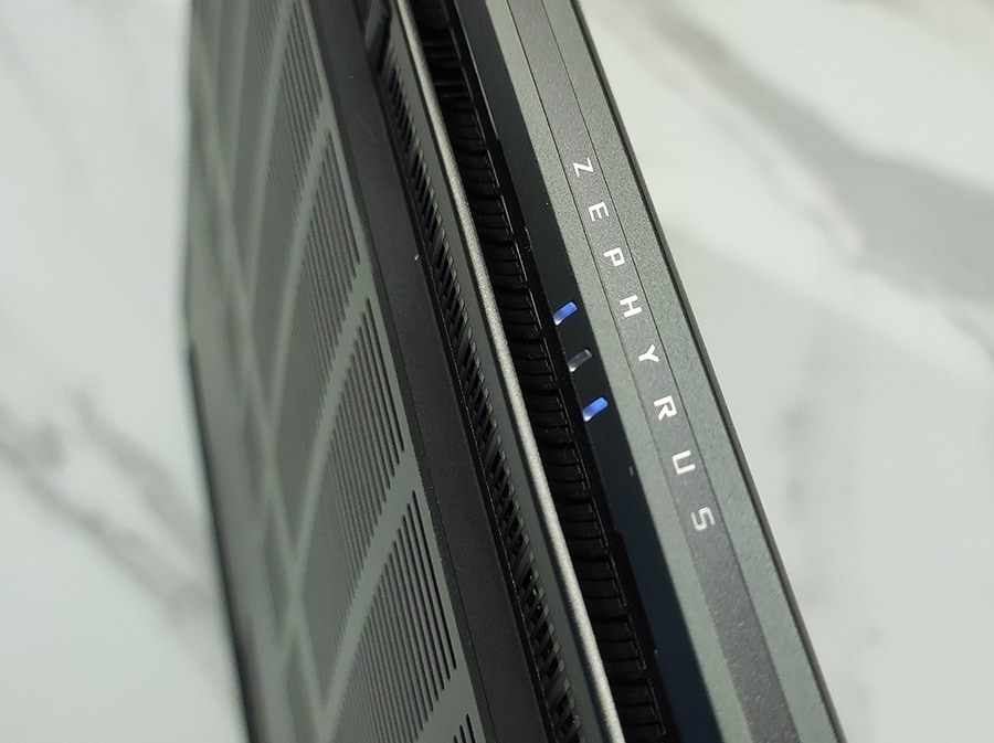 Paremal küljel leiavad kasutajad SD-kaardilugeja (UHS-II), USB-A 3.2 Gen 2 (10 Gbit/s) ja USB-C 3.2 Gen 2 (10 Gbit/s, DisplayPort 1.4, toiteülekanne). Mõlemad USB-C pordid toetavad kuni 100 vati suurust toiteülekannet ja vasakul asuv port toetab Thunderbolt 4. Oluline võib olla märkida, et Zephyrusel puudub sisseehitatud Etherneti ühendus - selle funktsionaalsust vajavad kasutajad peavad kasutama USB-adapterit.