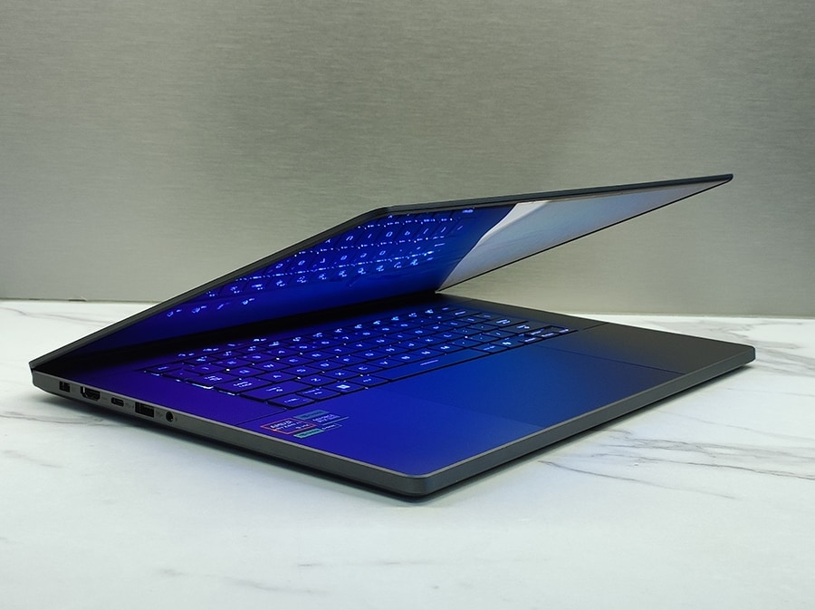 Zephyrus G16 vaatenurkade stabiilsus on suurepärane, kus ainult suured kõrvalekalded keskelt põhjustavad kerget sinist helki, mis on tüüpiline OLED-ekraanidele. Märkimisväärselt suunavad jahutusavade avad tagaosas sooja õhku pigem pinnale kui otse ekraani alumisele servale.