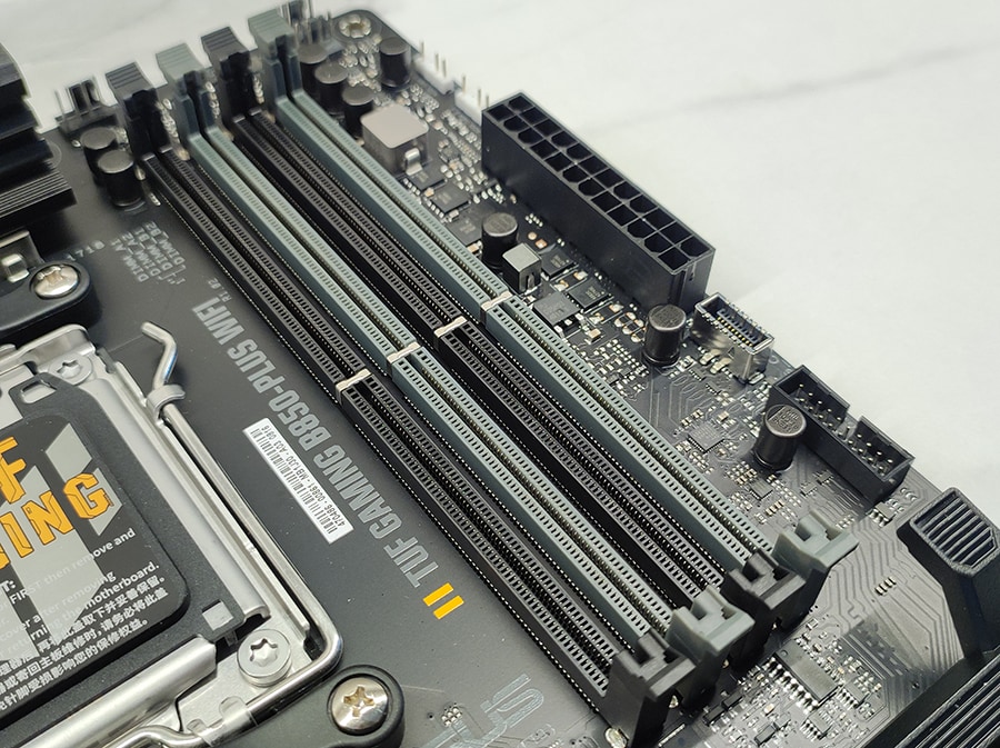 ASUS TUF Gaming B850-PLUS WiFi toetab kuni nelja DDR5 mälumoodulit, maksimaalse mahuga 192 GB. Toetatud on kuni 8000 MT/s kiirused (ülekiirendatuna).