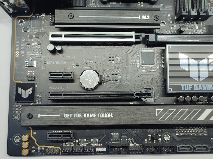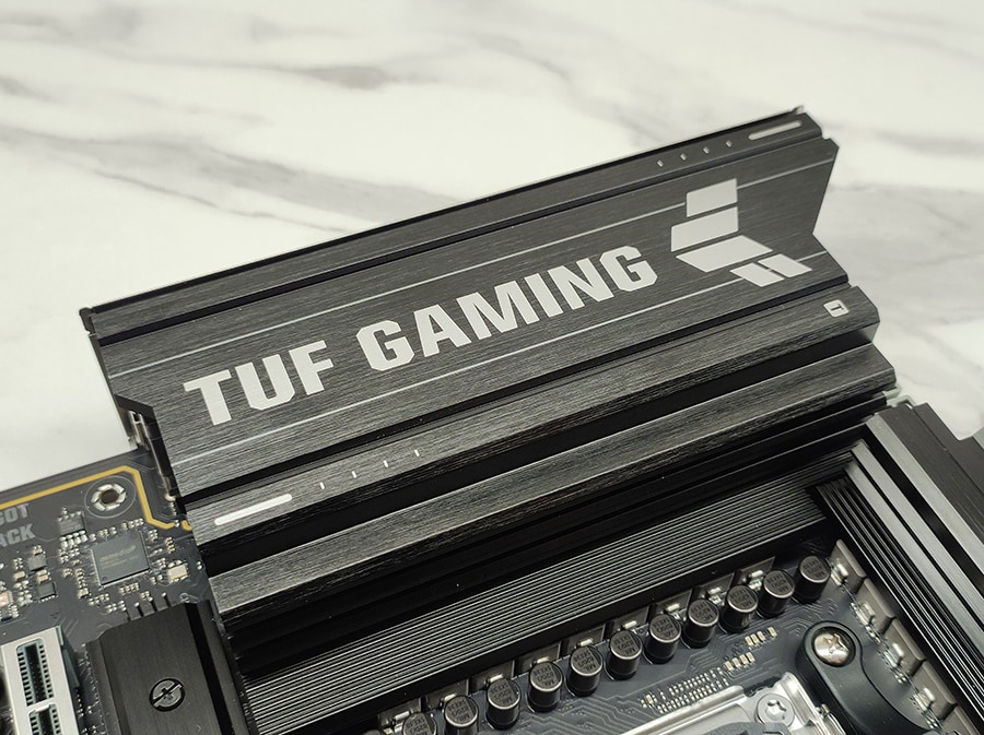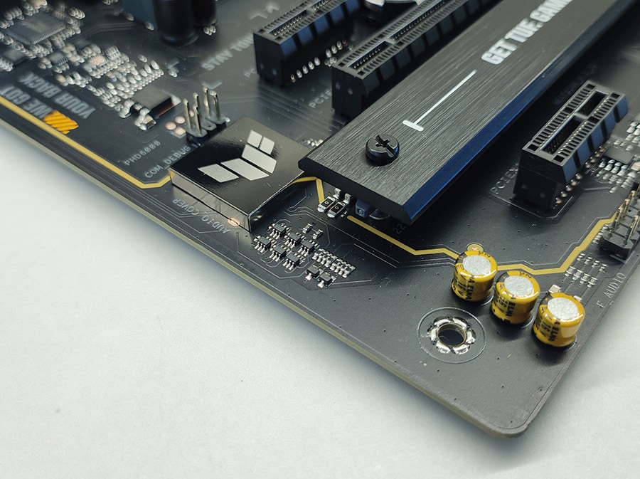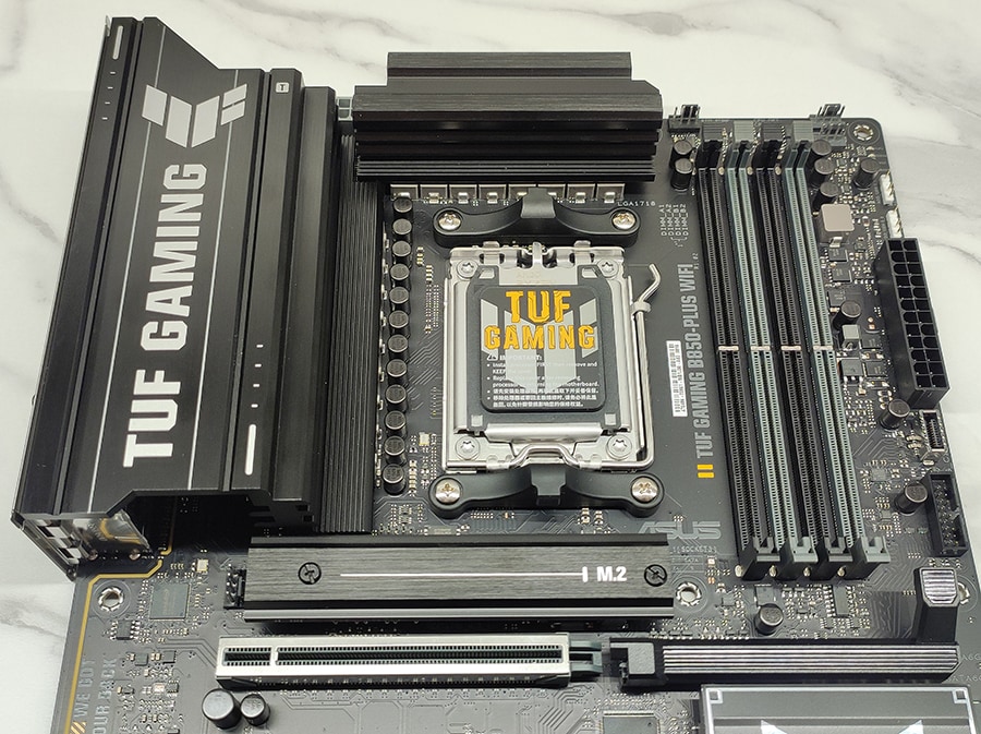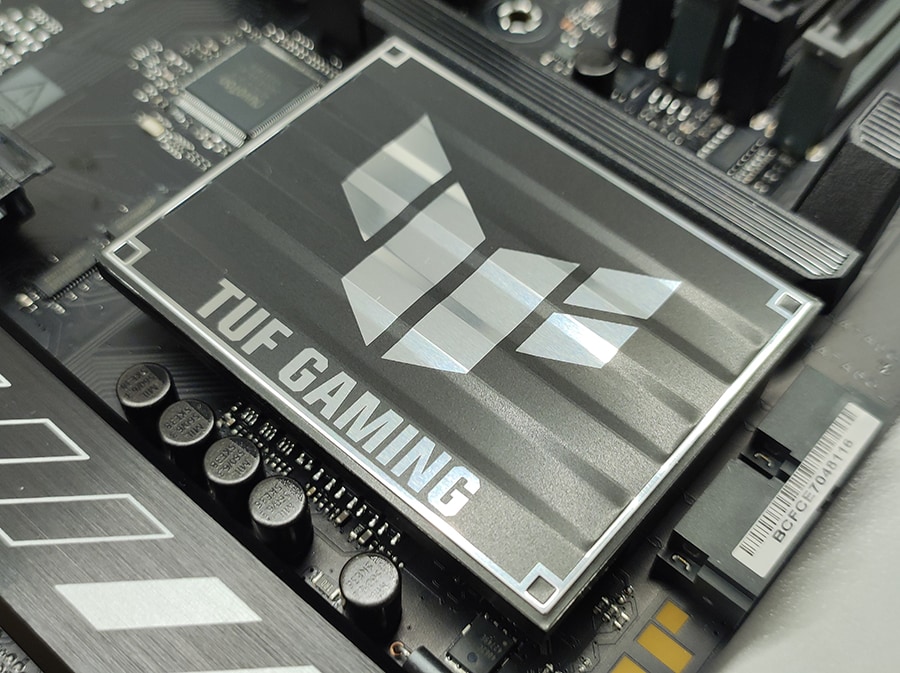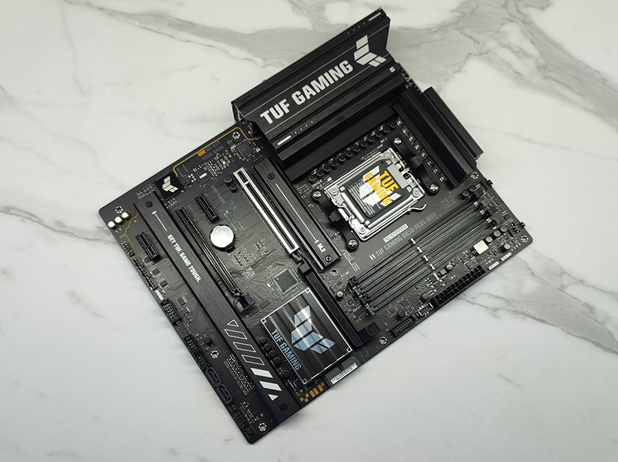 TUF seeriale omaselt on emaplaat vähem ROG seeriale sarnaselt pilkupüüdev ja on pigem industrial/tööstusliku muljega. PCB/räniplaat on mati musta-halli värvilahendusega ja jätab minimalistliku esmamulje ja omab suurt jahutusradiaator VRM-ide jaoks ning väiksemat NVMe M.2 SSD jaoks. Emaplaadi üldine paigutus on hästi läbi mõeldud – kõik pesad on loogilistes kohtades ning ligipääsetavad isegi suuremate jahutitega.