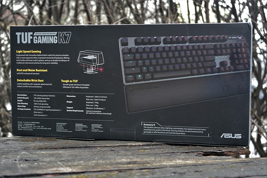 Esimest korda on TUF seeria pakend põhimõtteliselt identne ROG seeriaga – tavapärane tuhahall on asendatud mustaga ning kui aus olla, siis meile see isegi meeldib. Kuid võrreldes ROG-iga on pakend ikka väga tühi – esiosalt leiab klaviatuuri kujutise ning Aura Sync logo.