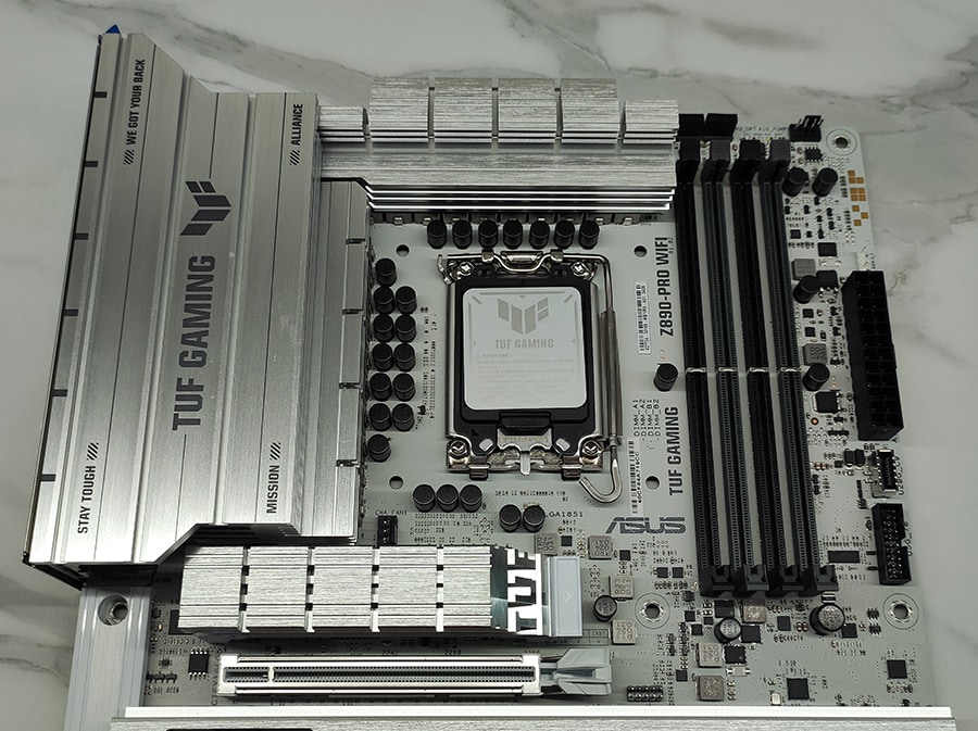 Z890-PRO jälgib TUF seeriale omast disaini, kuid võrreldes TUFi enamike emaplaatidega, mis on mustade ja hallide toonidega, on Z890-PRO täielikult hõbevalge. Neile, kes siiski eelistavad traditsioonilist musta emaplaati, on olemas sarnane mudel TUF Gaming Z890-PLUS WiFi näol. Heledat disaini on täiendatud tavapärase brändinguga ja RGB on praktiliselt olematu (v.a paremal ülemises nurgas asuv üliväike element).