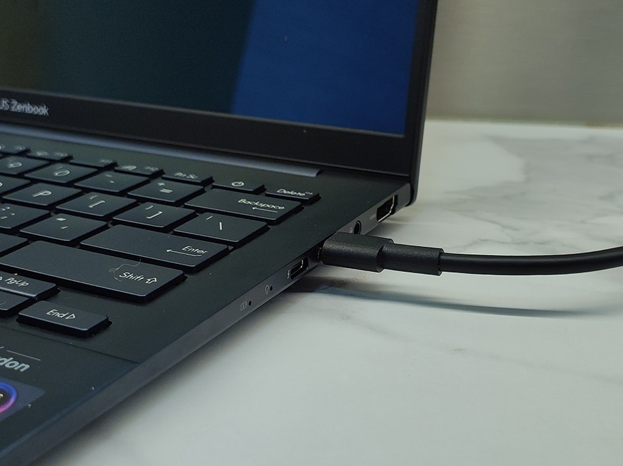 Zenbook 14 OLED ekraan, kuigi mitte kõige energiatõhusam mudel, tarbib tavaliselt maksimaalsel SDR-heledusel umbes 10 vatti. Siiski tekib koormuse all tavaline probleem kompaktsete sülearvutite puhul, kui neile on paigaldatud vaid 65-vatine toiteallikas. See võimsus ei ole piisav, kui protsessor üksi võib lühiajaliselt tarbida kuni 64 vatti.