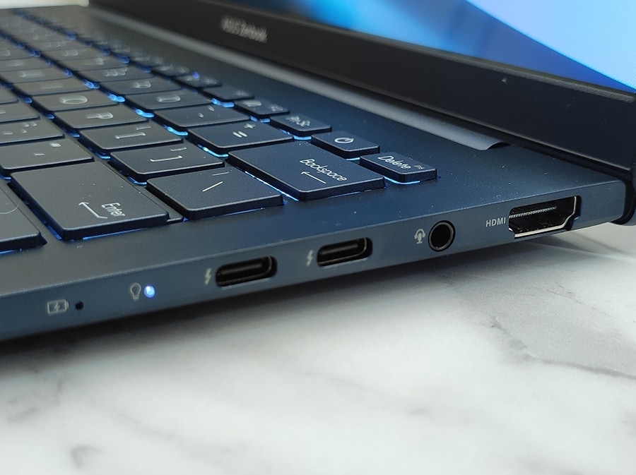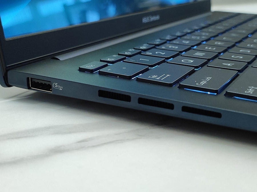 Zenbook 14 hõlmab kõiki olulisi ühenduvusstandardeid, kaasa arvatud USB-A, USB-C ja HDMI pordid, tagades sujuva funktsionaalsuse igapäevastes toimingutes. Siiski on suure miinusena laadimisport paigutatud paremale poolele, mistõttu kipub hiirt kasutades jubedasti ette jääma.