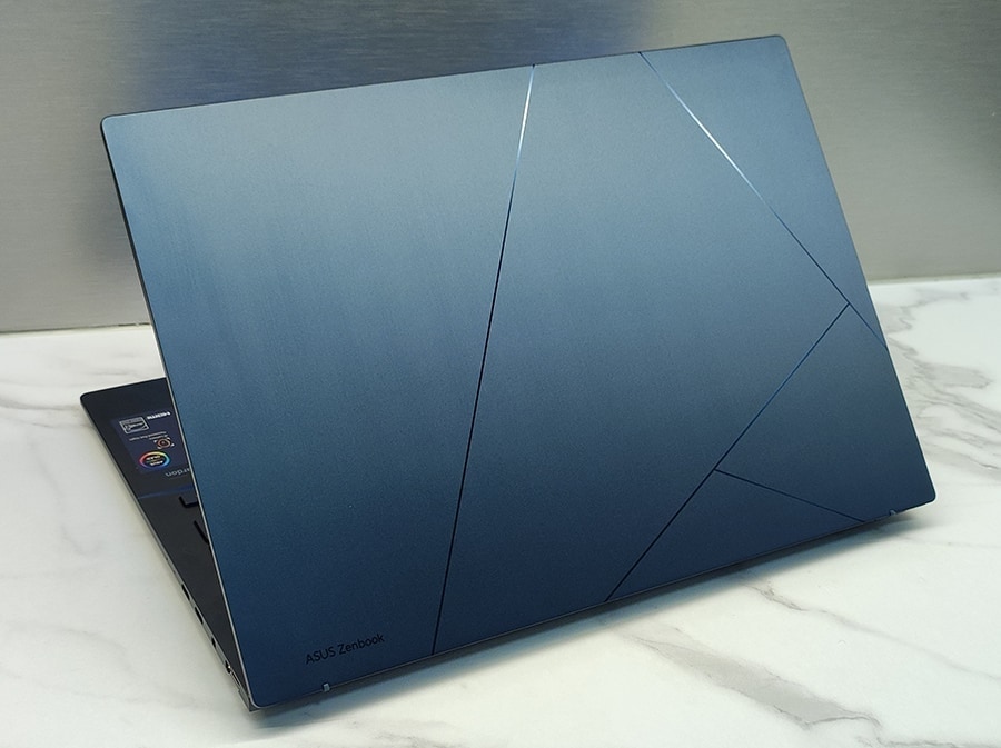 Zenbook ise kaalub vaid 1,208 kg, kuid säilitab siiski erakordse stabiilsuse tänu metallkonstruktsioonile. Kuigi klaviatuuri keskosa näitab tugevama surve all veidi painduvust, ei tohiks see tavalisel kasutamisel muret tekitada. Ekraani kaas peegeldab samuti stabiilsust, toetudes kvaliteetsetele hingedele. Zenbooki maksimaalne avanemisnurk ulatub 180 kraadini.
