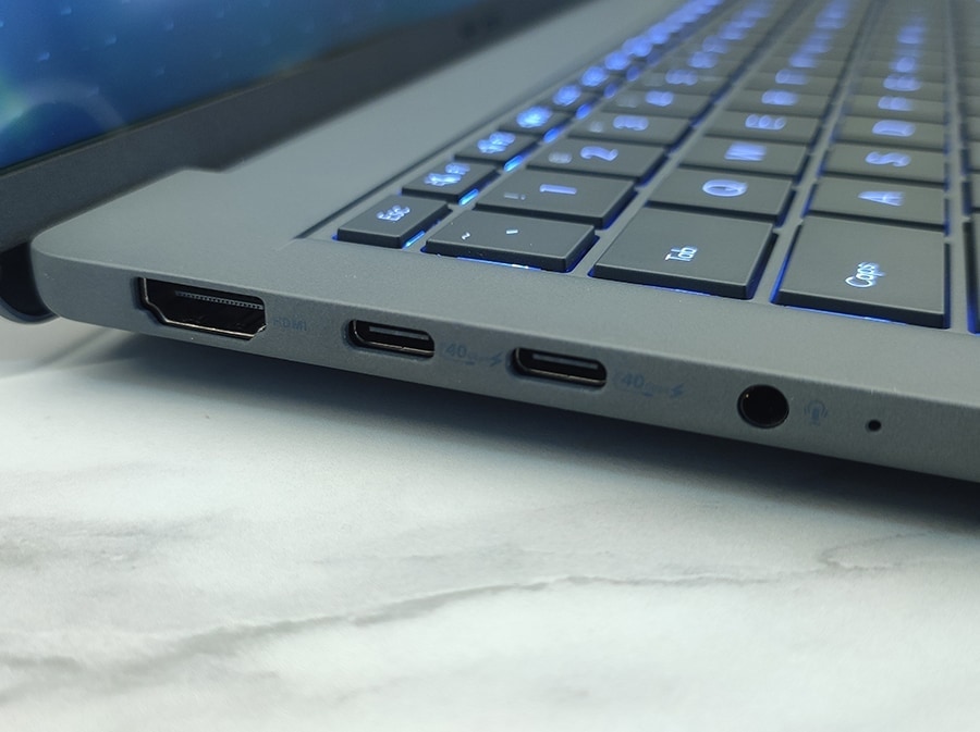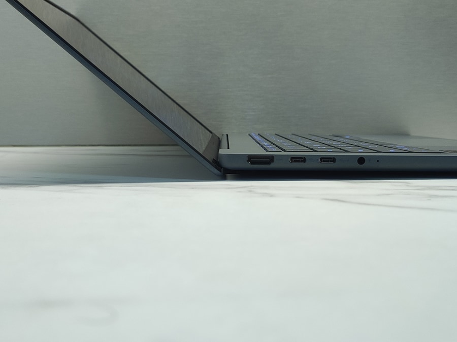 Zenbook A14 UX3407RA vasakul küljel on kaks USB C pesa, mis võimaldavad kuni 40 Gbps andmeedastust, toite edastust (Power Delivery) ja välisekraanide ühendamist DisplayPort kaudu. Lisaks leidub üks HDMI 2.1 liides, mis toetab kuni 4K @ 60 Hz väljundit ning on sobiv nii töömonitori kui multimeedia ekraaniga ühendamiseks.