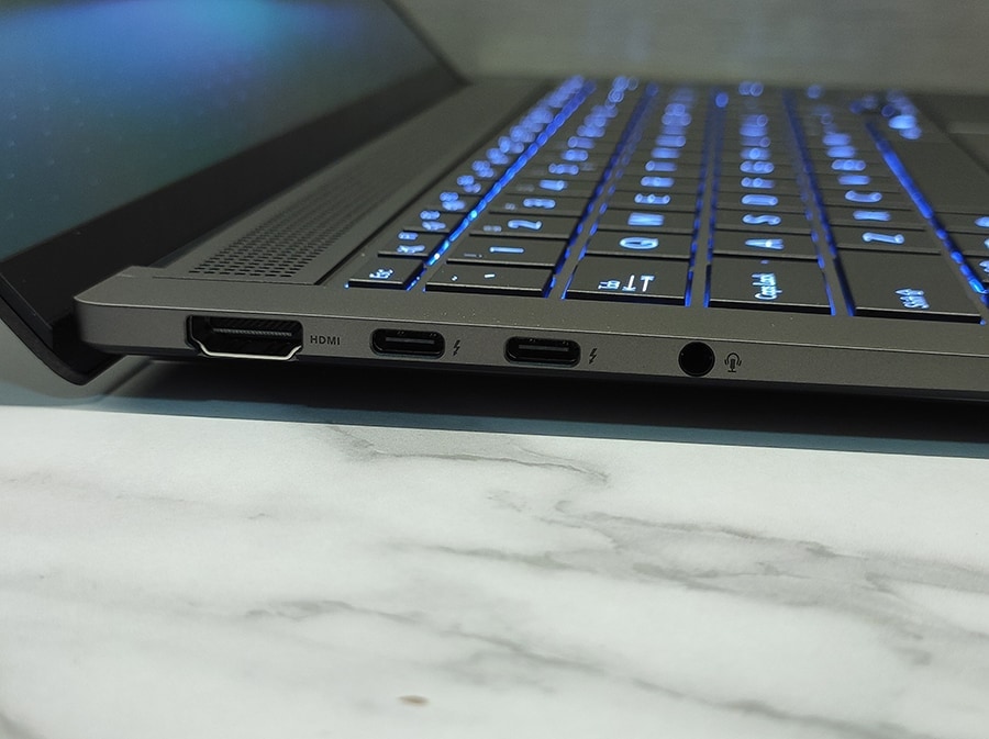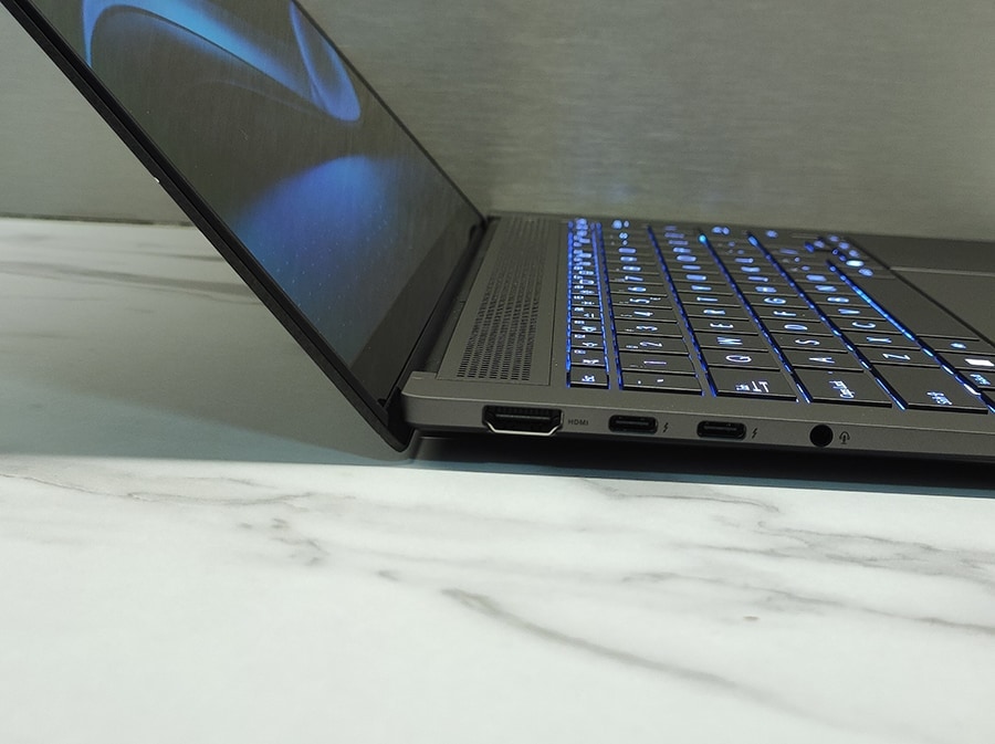 Zenbook S 14 pakub oma õhukesest disainist hoolimata igapäevaseks kasutamiseks piisavalt ühendusvõimalusi. Vasakul küljel on üks HDMI 2.1 port ning kaks USB-C 4.0 porti, mis toetavad Thunderbolt 4.