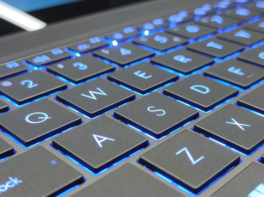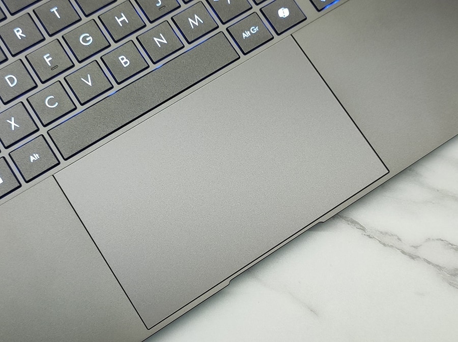 Zenbook S 14 klaviatuur pakub rahuldavat kirjutamiskogemust, kuid tasub märkida, et klahvide liikumissügavus on vaid 1,1 mm, mis ei pruugi kõigile meeldida. Klahvid on stabiilsed ja klaviatuur on vaikne, tühikuklahv teeb vajutamisel teiste klahvidega võrreldes veidi valjemat heli. Paigutus on üldiselt funktsionaalne, kuid üherealine Enter-klahv ja väikesed nooleklahvid võivad tekitada mõnele kasutajale ebamugavust. Klaviatuuril on kolmeastmeline valge taustavalgustus, kuid kõrgematel seadistustel võib sinakas toon olla veidi liiga intensiivne.