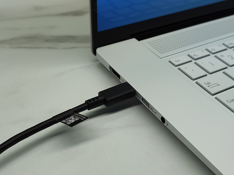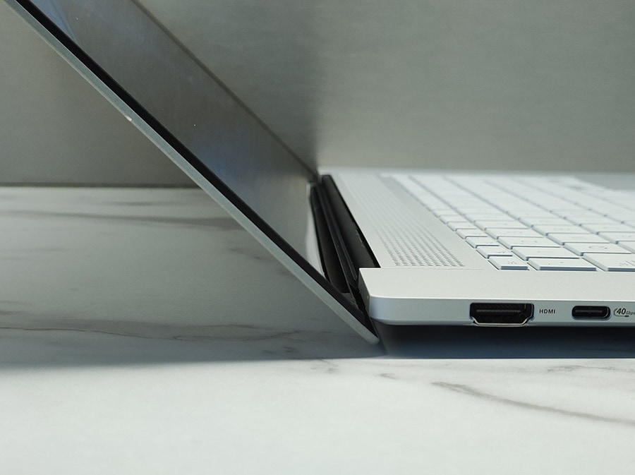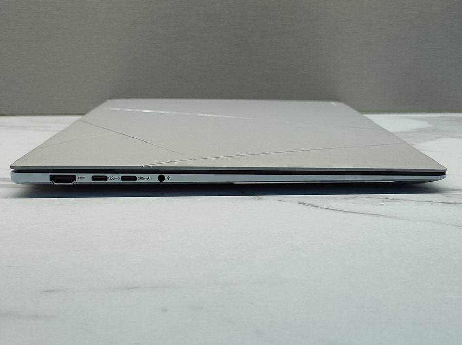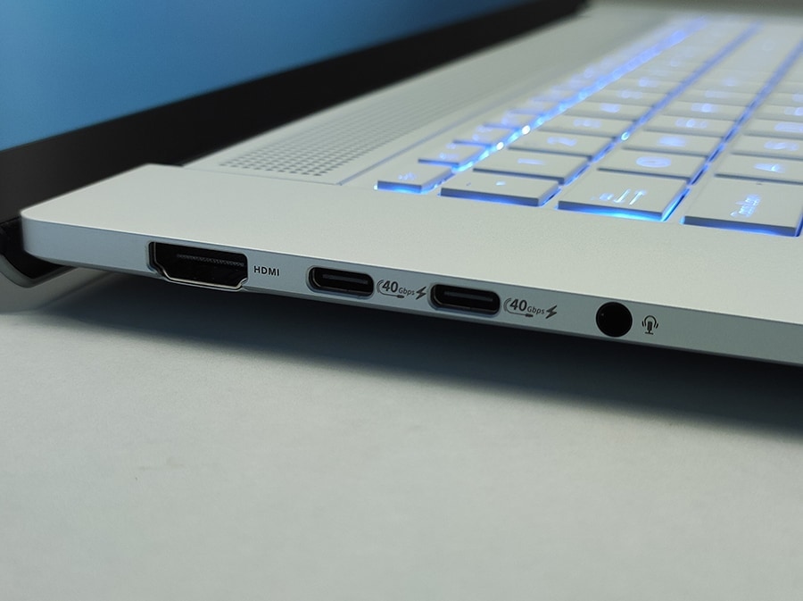 Vasakul küljel on kaks USB-C 4.0 porti (mõlemad toetavad DisplayPort ALT režiimi ja Power Deliveryt), HDMI 2.1 port ja 3,5 mm kõrvaklappide pesa.