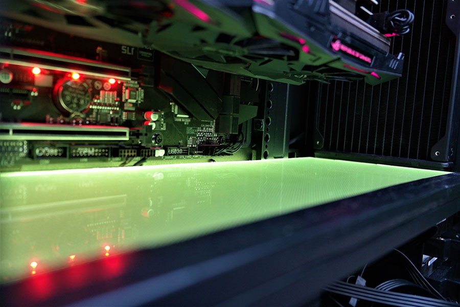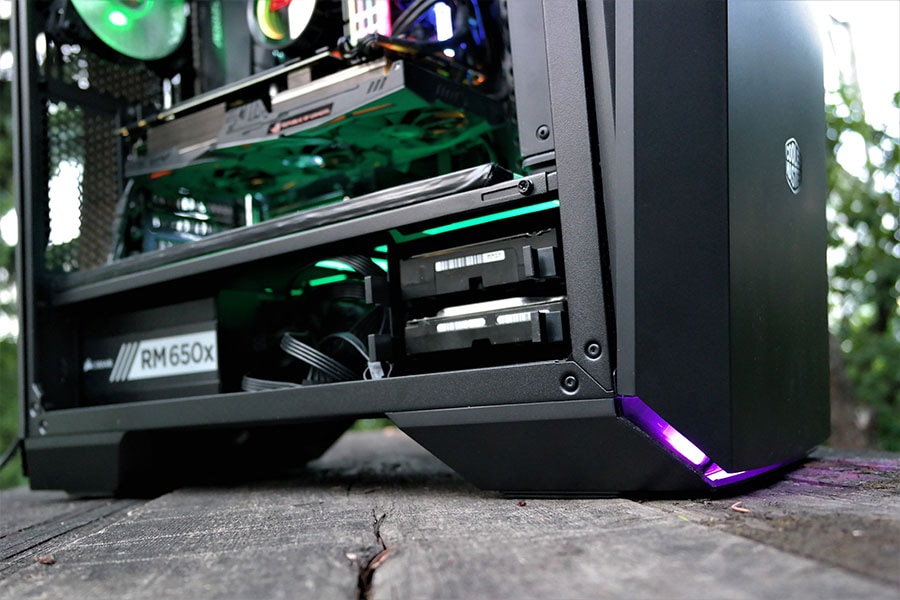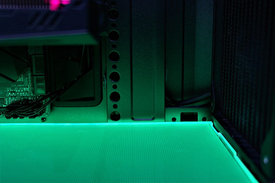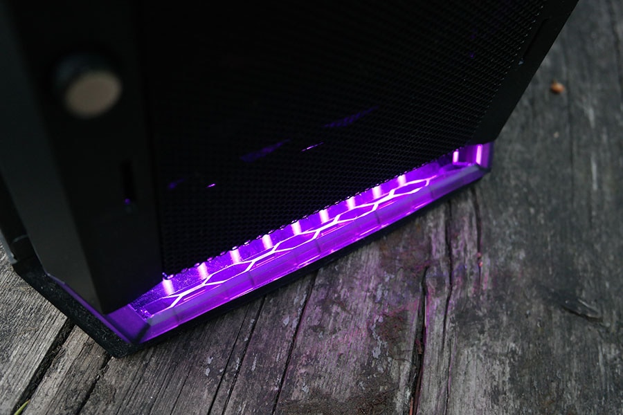 Rääkides LED valgusutusest, siis korpuse esiosas kõige all on olemas väike riba RGB valgustust. RGB on kontrolliatav siis omale meelepärase programmi kaudu (Aura, Fusion, Mystic Light, RGB LED, CM enda programm), või korpuse esipanneli nupu abil või kui soov puudub siis on võimalik ühendada otse toiteploki külge ja LED omab lillalt valgustust, millel on sujuv efekt valgustus reziimiks, mis mõnikord võib muutuda ebamugavaks kuna lülitub sisse ja välja.