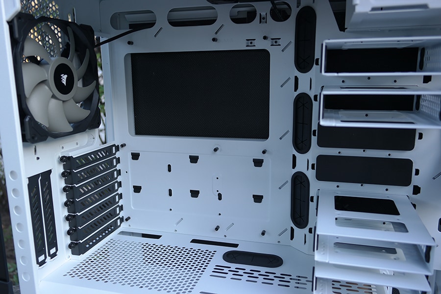Corsair on võtnud julge sammu ja lisanud 5.2 tollise optilise lugeja pesa ning arvatavasti on tegu ainulaadse korpusega 2019. aastal, mis tuleb eelnimetatud pesaga. Muidugi võib mõni leida sellele kasutust, kuid meie arvates ei ole see just kõige targem liigutus sellise hinna puhul. Samas on tegu eemaldatava pesaga ning välimuse poolest ei pea muretsema, kuna esipaneeli uks katab sisselõike ära ning lisaks on pesal omaenda katte olemas. Eemaldades optiliselugeja hoidiku, saab paigaldada pikema radiaatori või üleüldiselt kasutada vaba ruumi testsuguseks asjade paigutamiseks.