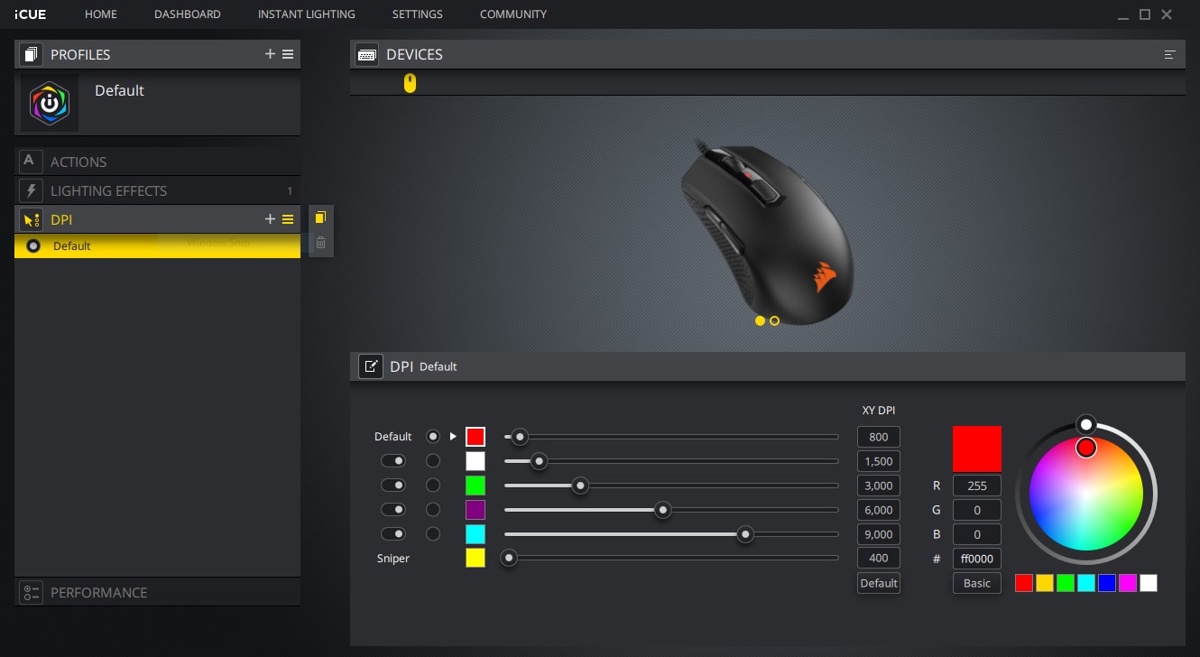 Valgustuse enda valik on suhteliselt kasin, valikus on rainbow, color pulse ning color shift, kuid sünkroonides teiste toodetega on võimalik valida ka teiste toodete režiimide vahel, näiteks rain või visor. Lisaks saab iCUE abil probleemideta muuta DPI seadeid ning programmeerida nuppe. Kusjuures programeeritavaid nuppe on M55 puhul kaheksa – kaks klahvi, rullik, DPI nupp rulliku kohal ning kaks nuppu paremal pool ning kaks vasakul. Tõenäoliselt jääb kasutaja siiski kasutama kas ainult paremat või ainult vasakut poolt, mistõttu jäävad tõenäoliselt kaks nuppu lihtsalt seisma.