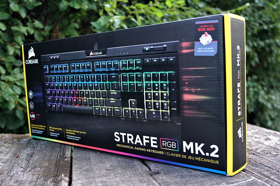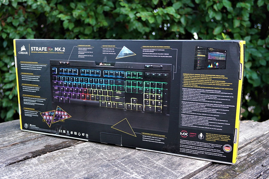 Nagu traditsiooniliselt ikka, on Corsair’i tunnusvärvid must ning kollane ning nii ka selle toote puhul. Pakendi esiosal on lausa kolmes kohas märgitud, et tegemist on Cherry MX switchidega, mis on kullast kontaktidega. Välja on ka toodud 8MB mälu profiilide jaoks ning dünaamiline mitmevärviline valgustus igas klahvis.