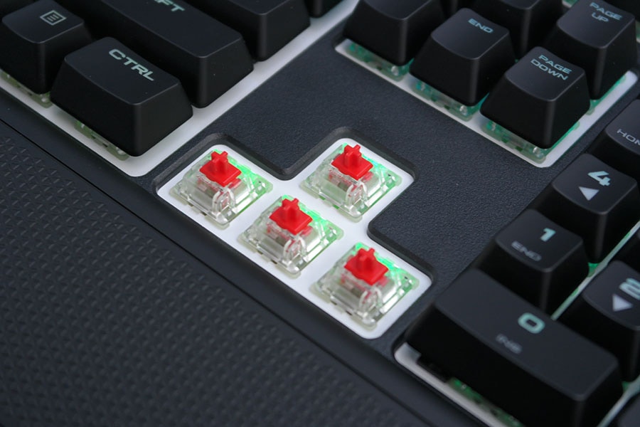 Klahvid on nii pimedas kui ka valges kergesti äratuntavad ning kaasa tuleb nii FPS kui ka MOBA erilise kujuga vahetatavad lisanupud. Klaviatuur on full size ning kõigele lisaks on olemas veel kolm nuppu vasakus ülemises nurgas - kollane vahetab režiime, valge heledust ning punane on nn gaming mode, kus nii Window klahv ja alt + tab kombinatsioon on välja lülitatud. Kui nuppude värvid muutuvad vastavalt valitud režiimile.