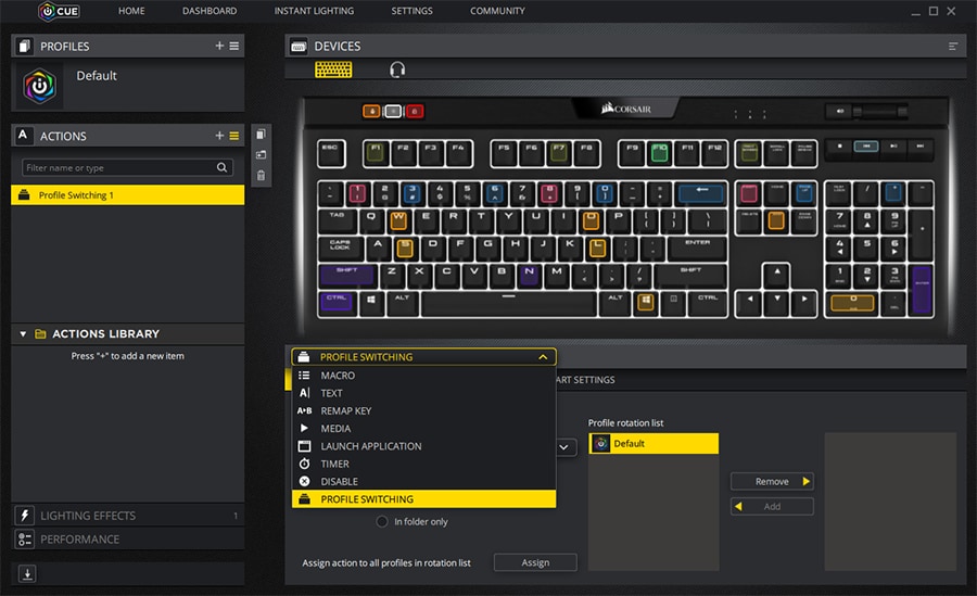 Samuti saab CUE abil lisada makrosid, klahve ja meedia nuppe ümber seadistada, kasutada taimerit enda tulemuste täpseks jälgimiseks, muuta profiilinupu ja Win Locki seadistusi ning värve. Kõigele lisaks on Corsair andnud kasutajatele vabaduse luua meelepäraseid režiime ise juurde ning neid teistega jagada. Ehk kui kasutaja ei leia endale sobivat värvilahendust, siis alati on võimalik see kas ise teha või kogukonna poole pöörduda.