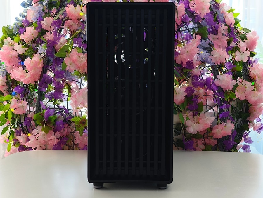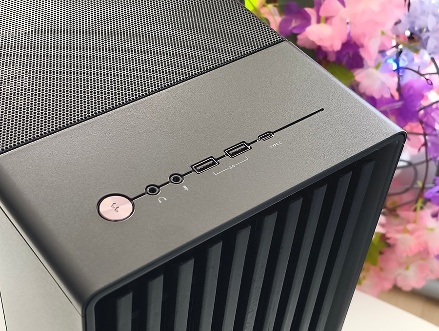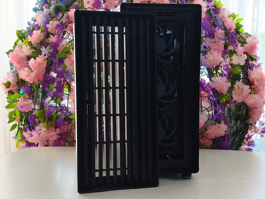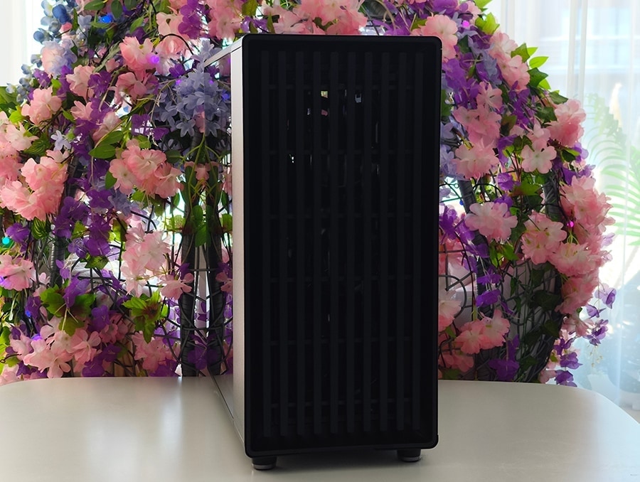 Korpuse kõige iseloomulikum element on esipaneel, mille moodustavad vertikaalselt paigutatud puiduliistud. Need ei ole pelgalt dekoratiivsed, vaid loovad struktureeritud sissevõtukanalid, mis juhivad õhu korpusesse, säilitades samal ajal ühtse ja mööblilaadse üldmulje. Konstruktsioon on märgatavalt massiivsem kui tüüpilisel võrkesipaneelil. Lisatud paksus toetab korpuse rafineeritud välimust, isegi kui see tähendab veidi suuremat õhuvoolu takistust võrreldes äärmiselt avatud disainidega.
