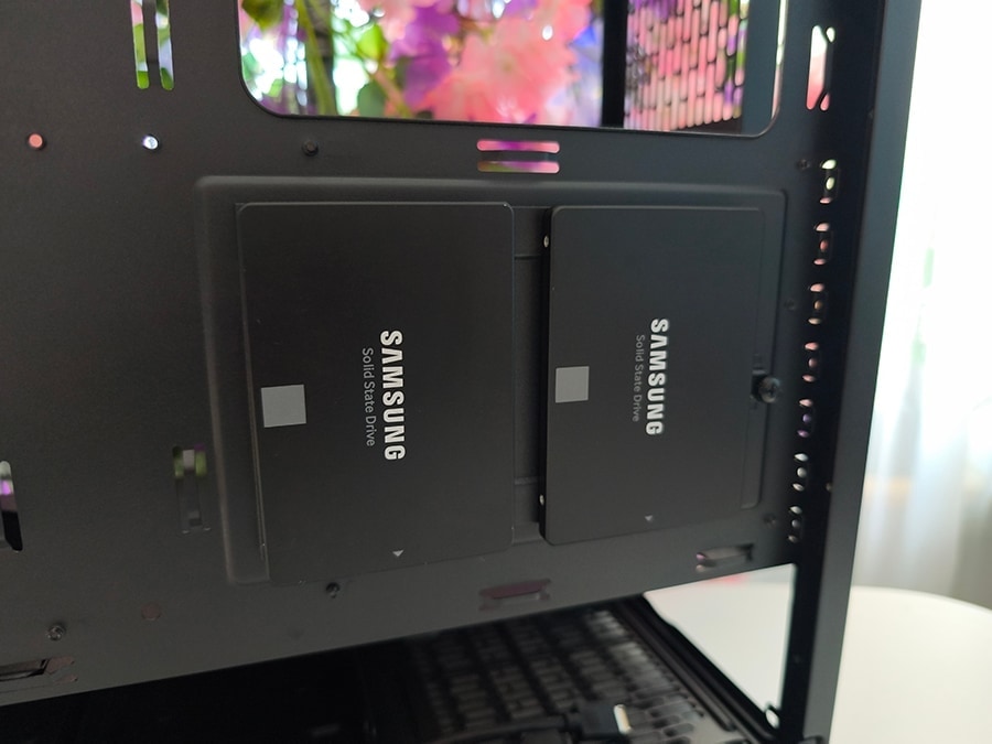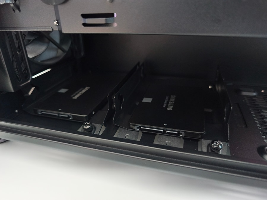 Salvestuslahendused on puhtad ja lihtsad. Kaks eraldi 2,5-tollist kinnituskohta asuvad emaplaadialuse taga, samas kui kaks kombineeritud 3,5-/2,5-tollist pesa paiknevad alumises kambris.