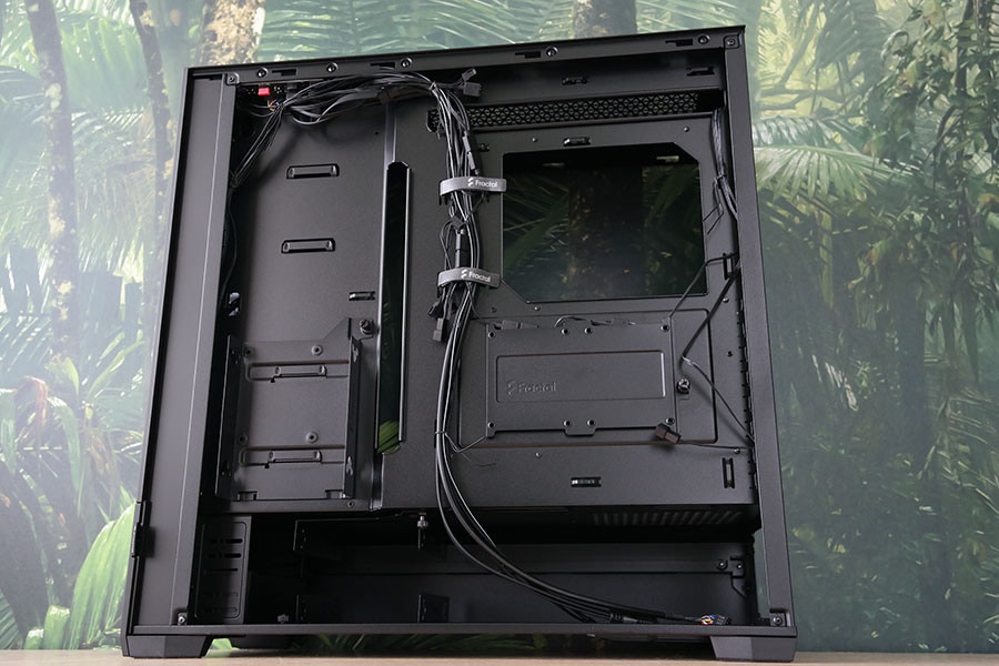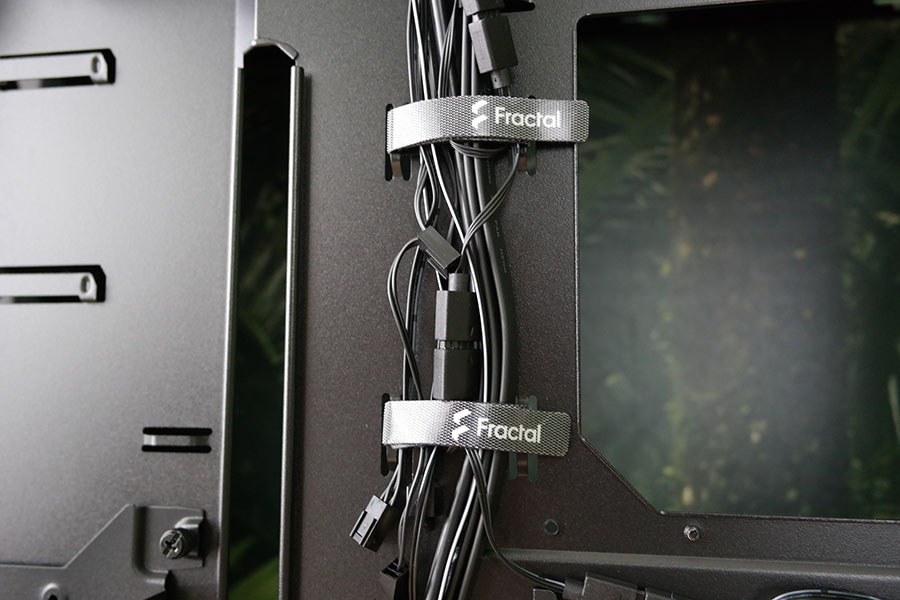 Kaablimajandus on suurepärane tänu Fractal Design poolt disainitud ekstra suured läbipääsuavad juhtmete joaks. Kaks suurt ava paiknevad emaplaadi ülemises osas ning paremal küljel. Suuruse poolest katavad nad ära peaaegu kogu ATX emaplaadi küljed, seega ei pea muretsema kust august tuua kaabel soovitud pesasse. Lisaks selliste avade rakendamine aitab kokku hoida ka kaablimajandusaukude puhul kasutatavate kommikinnituste pealt.