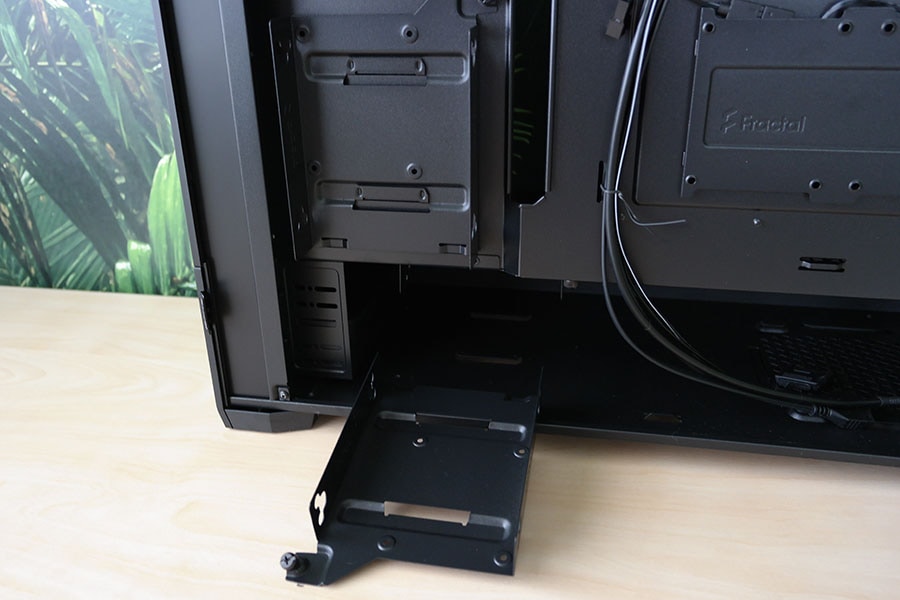 Korpusel on eriti mitmekülgne tugi salvestusseadmetele toiteploki sektsioonis. Juhul kui ei ole soov kasutada ODD seadet ehk siis 5.25 tollist seadet, siis toiteploki sektsioonis on kaks salvestusseadme kinnitust. Ühe kinnituse külge saab panna ühe 2.5 ja 3.5 tollise seadme, mis meie arvates on igati ruumisõbralik. Tihti saab kinnitada ainult ühe seadme, et kas SSD või HDD, aga Fractal Design on leidnud mooduse lasta kasutajal kinnitada kaks seadet. ODD seadme lisamisel saab kasutaja valida kas paigutada ülemisele või alumisele positsioonile, vastava positsiooni valimise tagajärjel peab eemaldama HDD/SSD kinnituse.