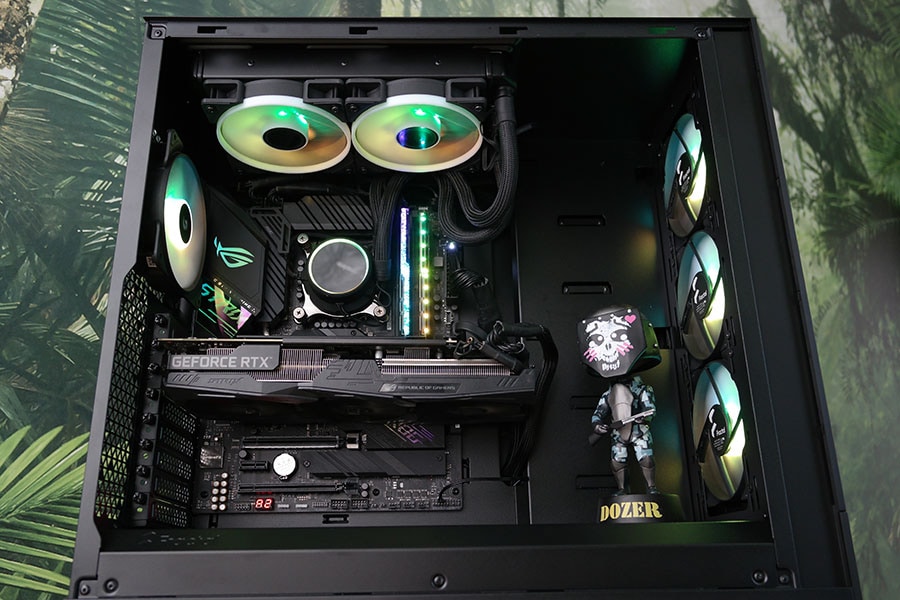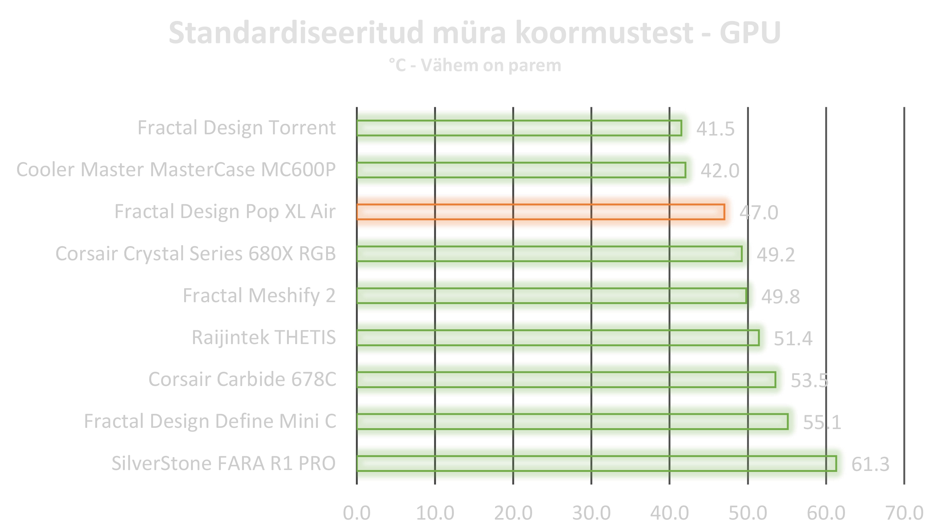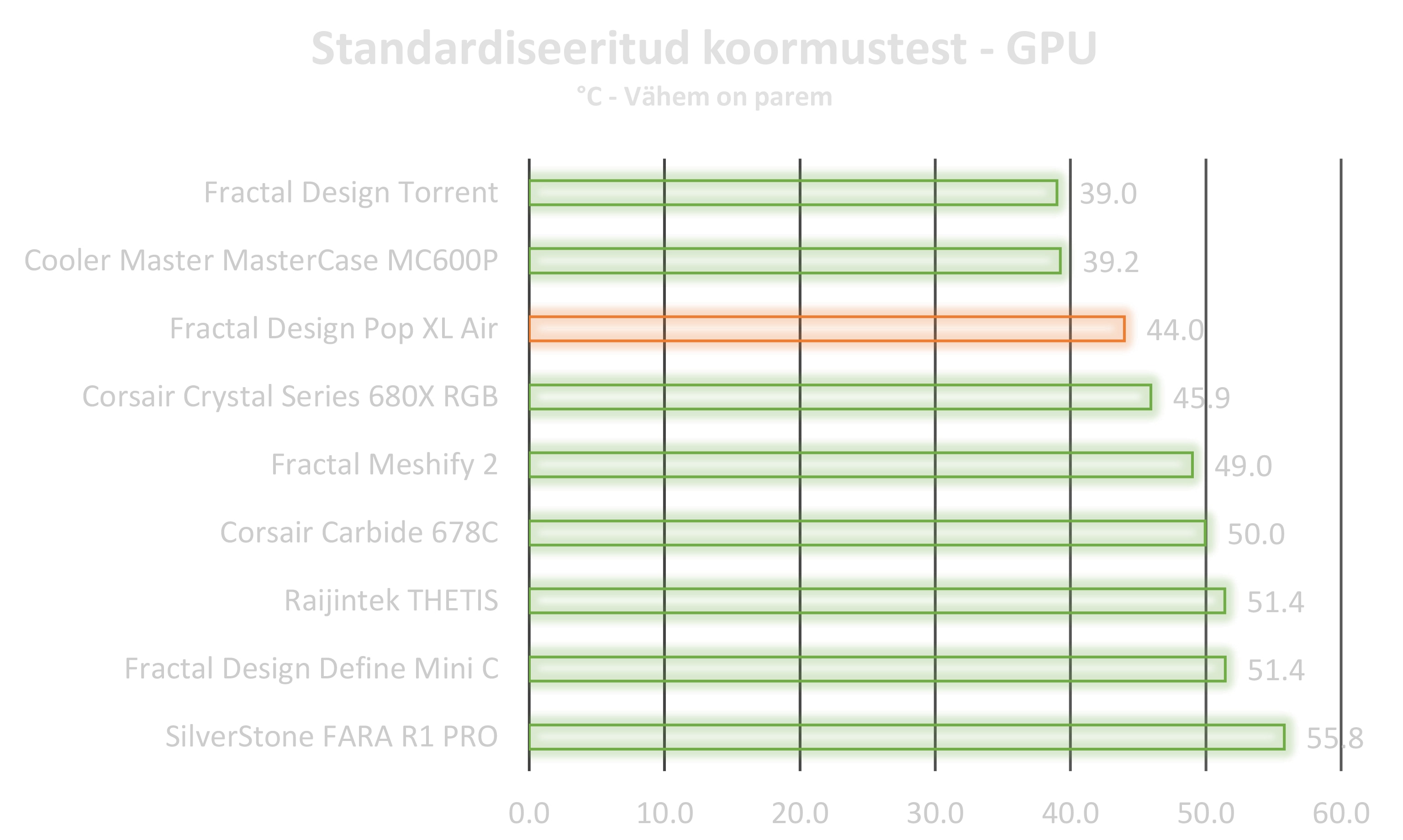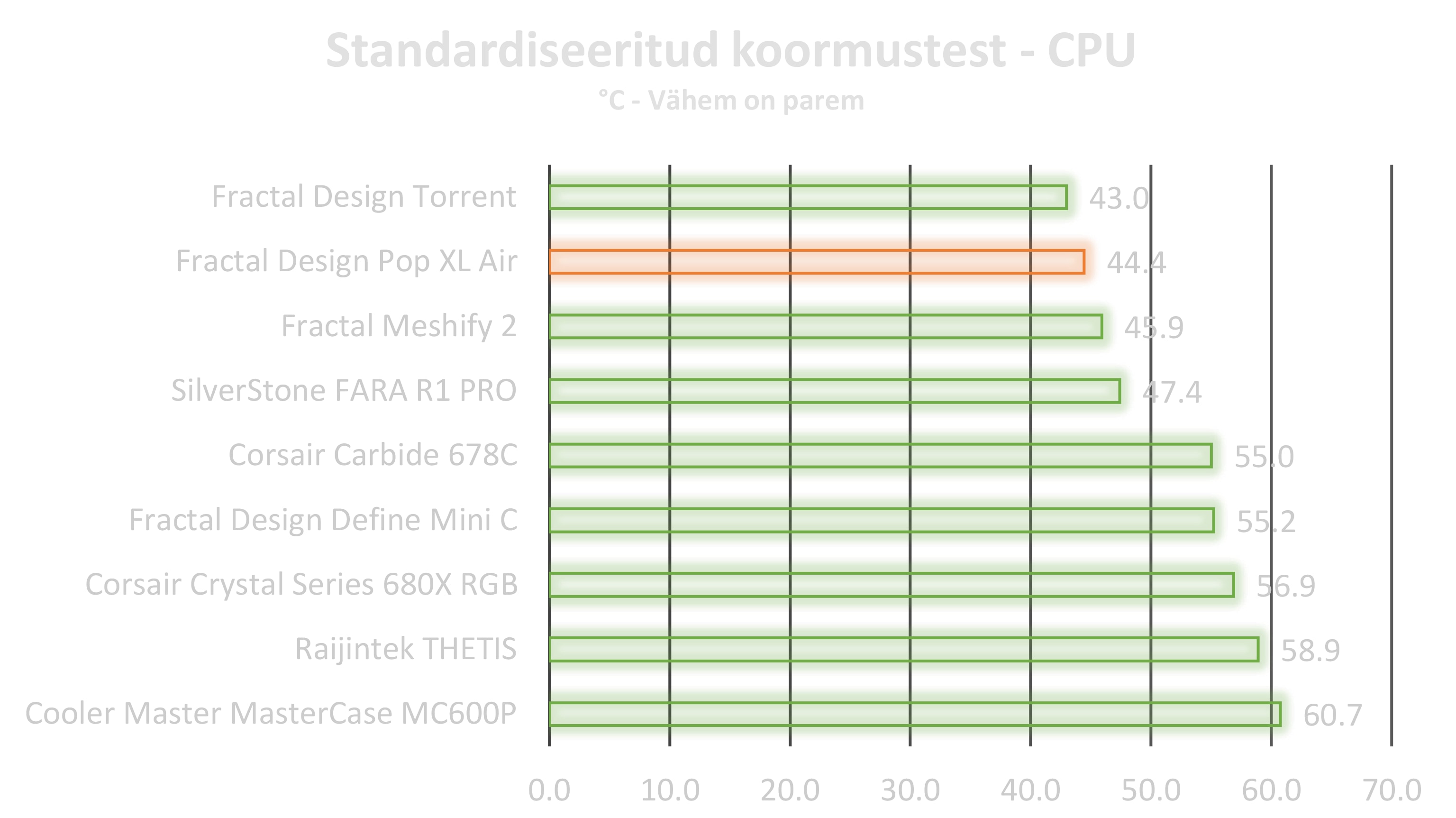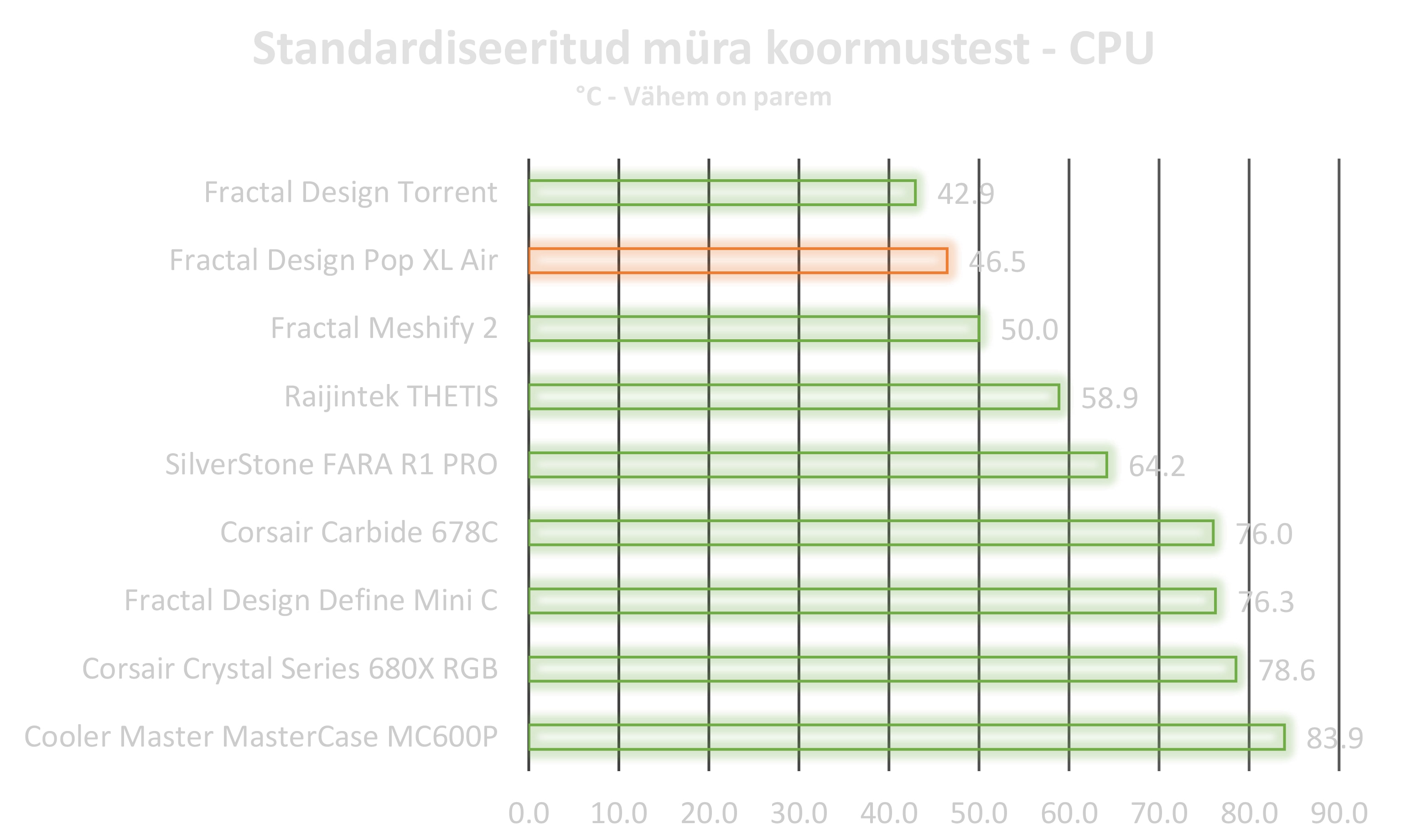 Algne plaan oli rakendada korpuse ette 3x 120 millimeetrilase ülesehitusega kõik ühes vesijahuti, kuid selgus, et Fractal Design on väga mõnusalt ruumika ülesehituse võimaldanud kasutajatele ning vesijahuti paigutamine sinna sobis ideaalselt. Välimuselt on korpus väga soliidne ja kvaliteetsetest materjalidest. Eriti mõnus disainilisa oli väike sahtel 5.25 tollises pesas. Tekitas sellise üllatusmomendi, kui esimesel korral korpusele käpad külge sai pandud. Ega ei saa üle ega ümber RGB, mis sellise hinnaklassi juures on väga mõnus, lisaks veel kontroller mis on korpusesse sisse ehitatud. Lisaks ventilaatorite toite ja valgustus kaablite ühendus võimalus üksteise jätta tagab kerge kaablimajanduse ja ei pea muretsema, et emaplaadil jätkuks piisavalt pesasid. Korpuses oli väga ruumiks ehitada ning mõnus oli näha lisatarvikute ostmise võimalust. Meie poolt tarvikute pakkumisele suur pluss, sest ega tõesti korpuse puhul väga ei lähe kõik need HDD ja SSD pesad kasutusse. Pluss juppide vähendamine võimaldab tuua korpuse hinda alla. Meie poolt igati positiivne soovitus Pop seeria korpustele, eriti XL Air suunas, kuna suutis koormustes saavutada väga hea tulemuse.