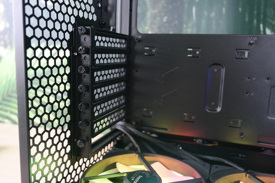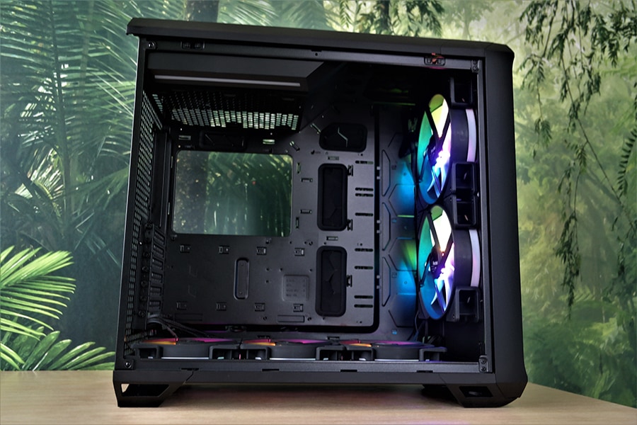 Korpus ise on piisvalt suur, et mahutada põhja kolm 140 mm ventilaatorit ning esipaneeli ja põhja paneeli ventilaatorid on vahetatavad ehk 180 mm ventilaatorid on toetatud ka korpuse põhjas – ametlik vahetus on toetatud ka Fractal Desing poolt, kuid me ei näe põhjust miks sa tahaksid seda taha kui just pole plaan minna mingi erilise vesijahutuse ülesehituse teed pidi. Korpuse emaplaadi poolele ei saa paigutada ühtegi 2.5 ega 3.5 tollist ketast, mille tugi on ainult emaplaadi tagumisel küljel. Millele Fractal Design on eelnevalt mõelnud on vesijahutus komponentide kinnitamine – selle all siis mõelda pumpa ja veehoidlat, mille jaoks on korpusesse tehtud piisvalt auke emaplaadi paremale küljele, et tagada võimalikult paindlik paigaldamine.