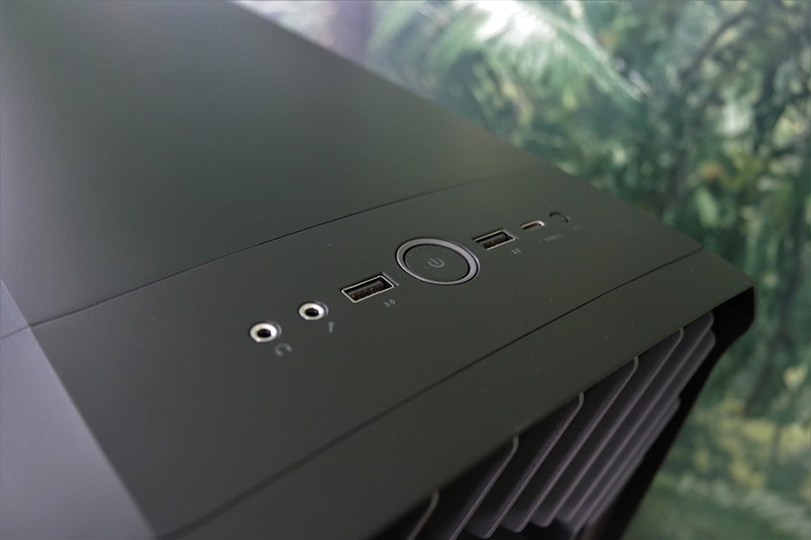 Ühenduspesade poolest on ülemiselt paneelilt võimalik veel leida kaks USB 3.0 Type-A pesa, ühe USB Type-C pesa ning eraldiseisvad pesad mikrofoni ja kõrvaklappide jaoks. Lisaks ka siis toite ja taaskäivitus nupp on ilusti olemas – toitenupp läheb ka keskelt põlema valgustades sisse lülitus logo. Ülemine paneel on kinnitatud kruvidega taga paneeli külge (näpuga keeratavad, aga tulid tehasest liiga kõvasti kinnikeeratult, et esimesel korral on vaja kasutada tööriista abi), seega ei pea muretsema, et korpuse liigutamisel ülesehitus laiali laguneb.