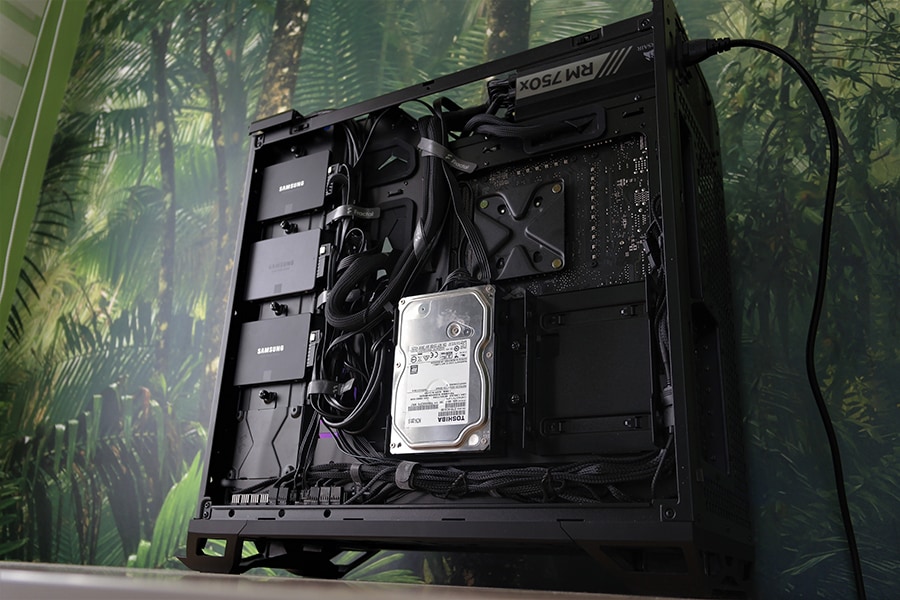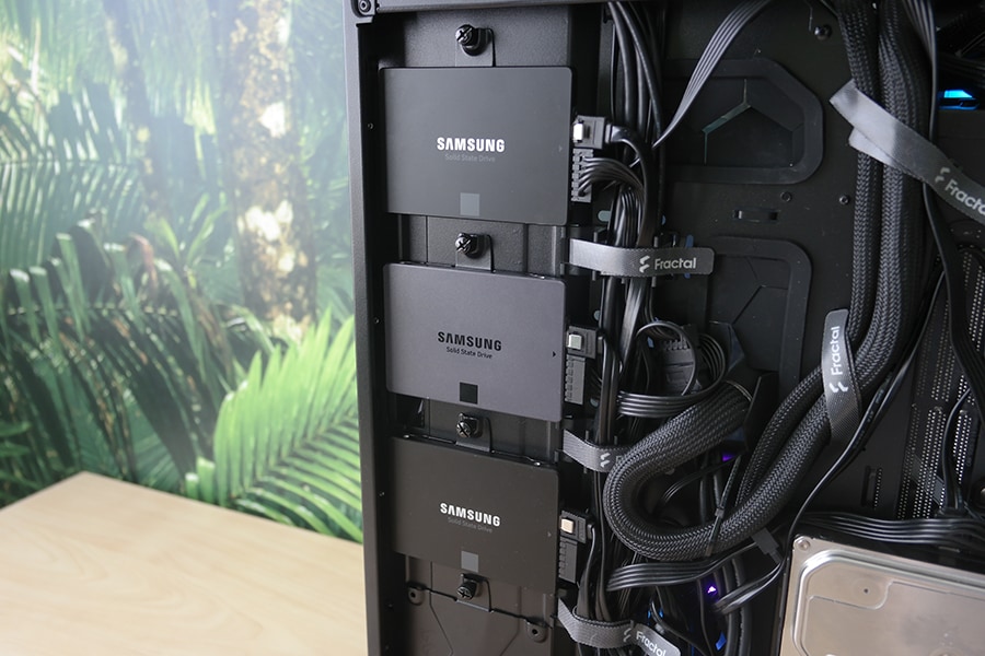 Korpuse tagamine osa on maksimaalse funktsionaalsusega ära kasutatud. Omades kahte 3.5 tollise ketta ja nelja 2.5 tollise ketta paigutusvõimalust. Meil isikulikult jäi SATA kaabli ülesehitusest puudu, et ühendada ühe kaabliga 3 SSD seadet. Kuna SATA toide on paigutatud just nii täpselt, et kolmest pesast saab ära kasutada ainult kaks äärmist – kuid meie puhul see väga probleemi ei tekitanud, kuna saime kasutada keskmise pesa ventilaatorite kontroll mooduli jaoks. Ma ei ütles, et Fractal Design oleks midagi halvasti disain – lihtsalt, et tasuks arvestada sellega, kui SATA seadmeid rohkem kui kaks. Protsessorijahuti kinnitus komponentide jaoks on jäetud piisvalt suur avausus, et ei tohiks tekkida probleeme ühegi jahuti kinnitamisel.