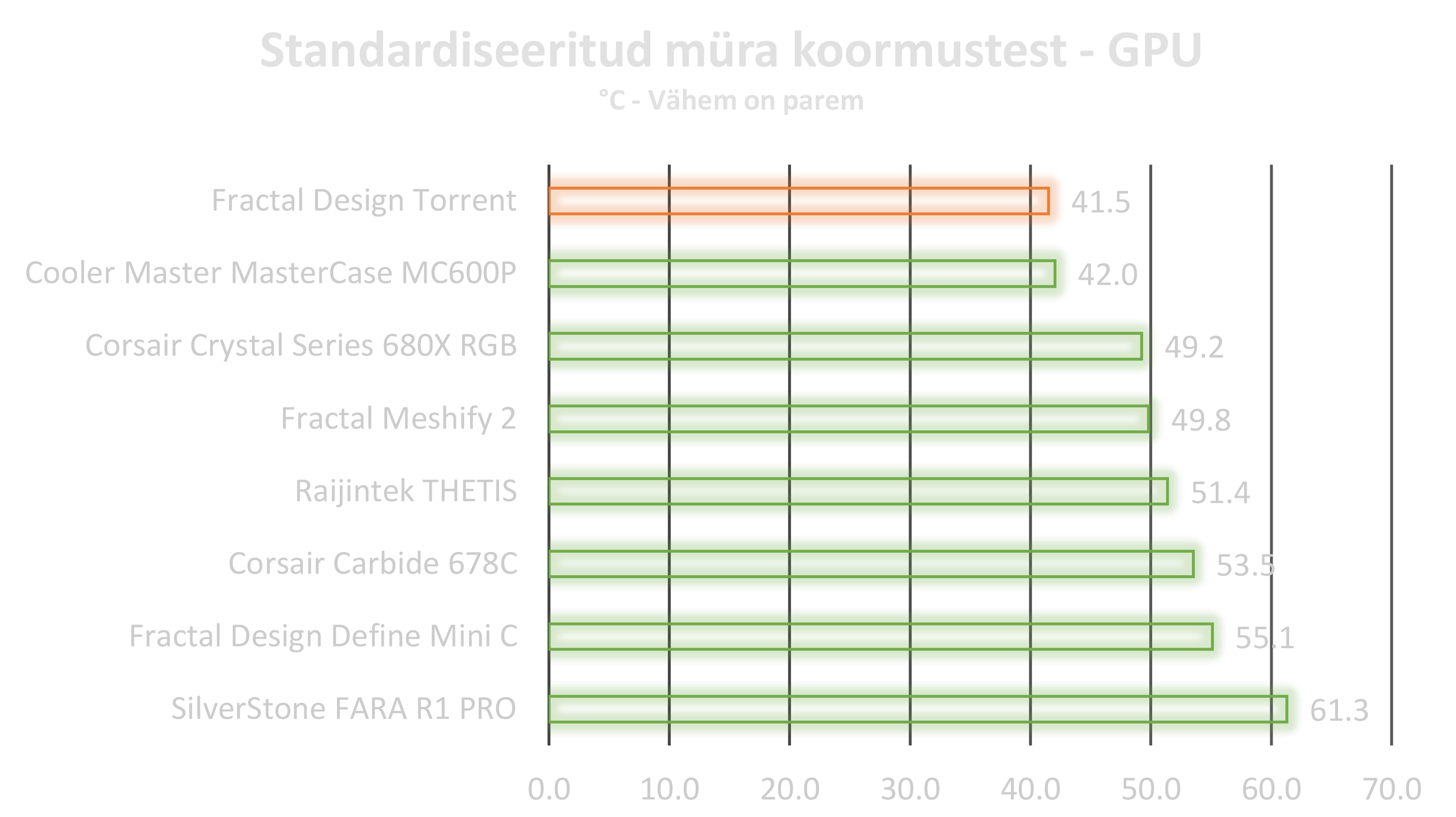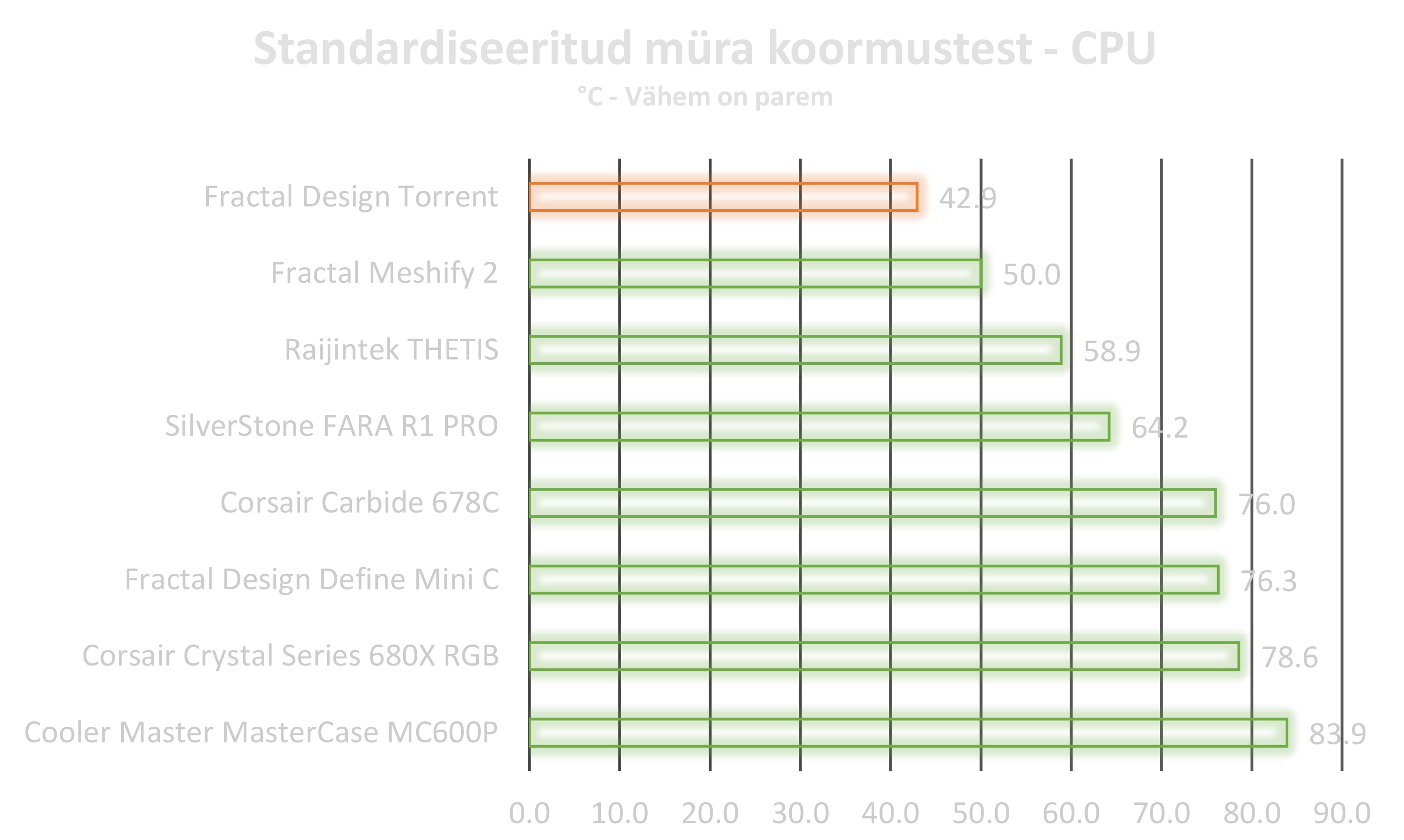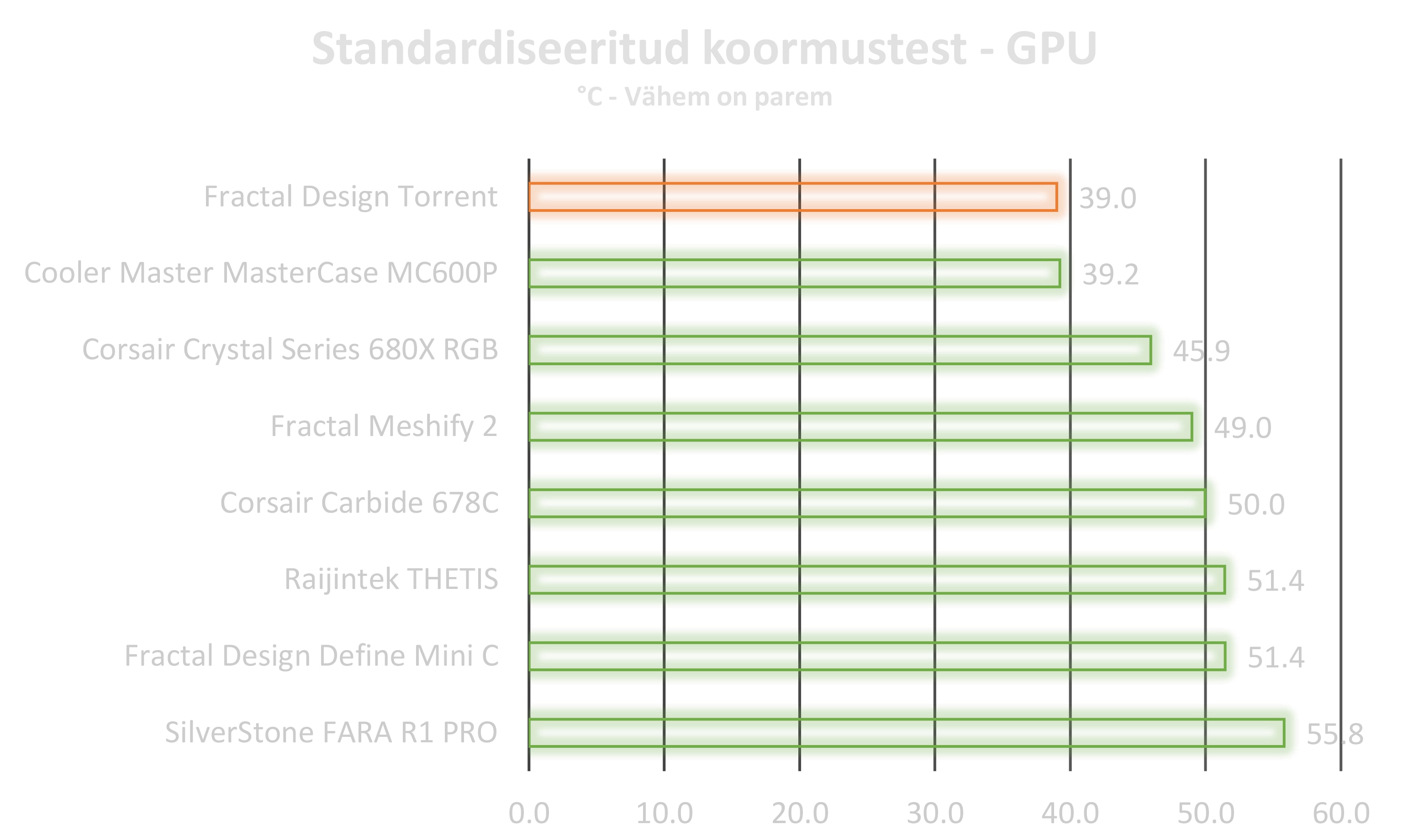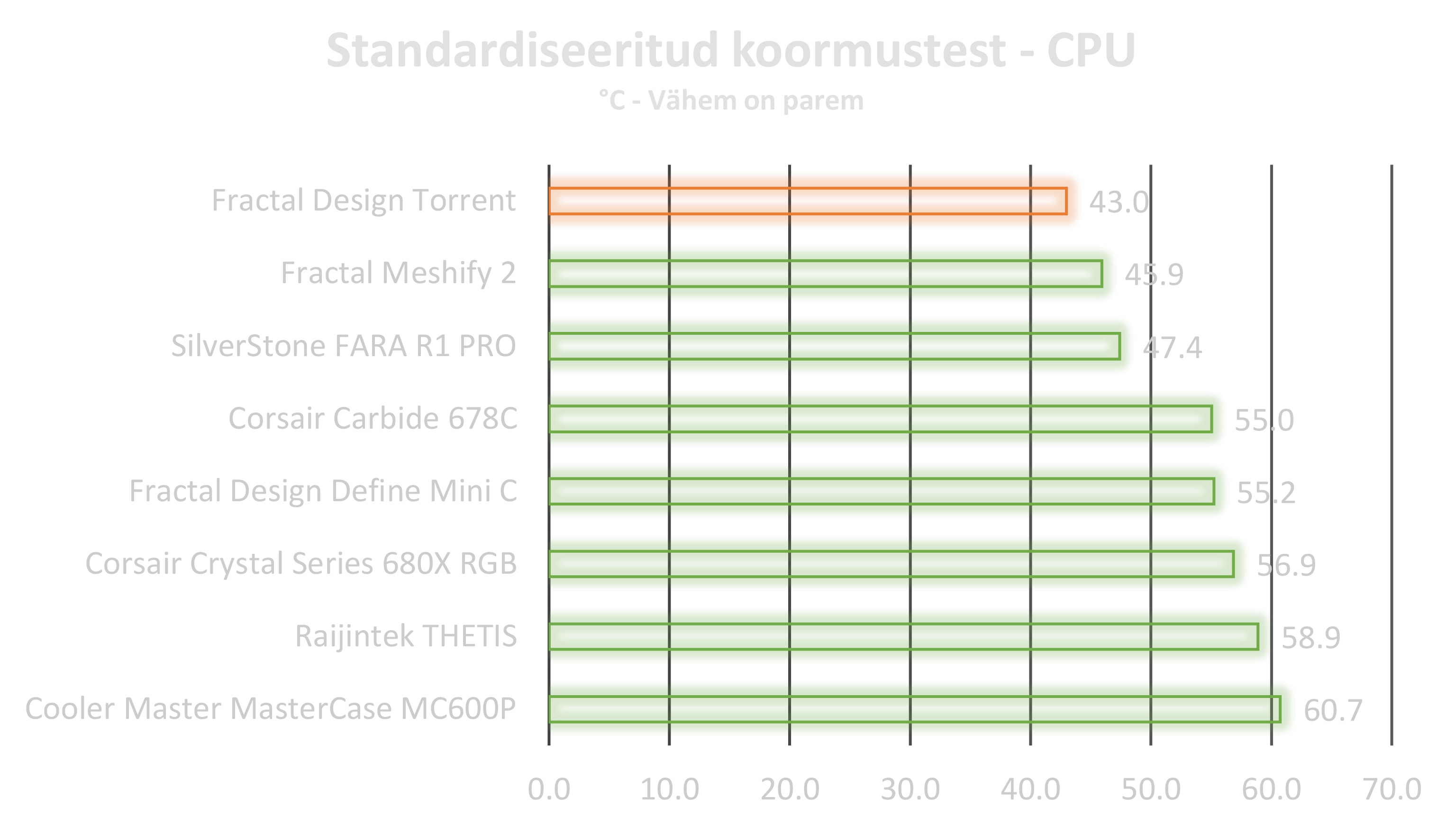 Korpuse hind võib olla natuke kõrgema poolne, kuid jahutus võimus on pea, et parim, mis praegu turul on saadaval. Ventilaatorid on suhteliselt lärmakad kui jahutusvõimus põhja keerata, kuid selleks ei ole vajadust kuna õhuvool on meeletult hea isegi ainult kasutades ventilaatorid 20% peal. Kui RGB ülesehitus ei istu siis on võimalik ka säästa 50 eurot ja valida versioon ilma RGB, kuid siklikult ütles, et RGB isegi istub ilusti selle korpuse puhul ning toiteploki juurde lisatud lisa riba on mõnus lisa. Kui on soov suurepärase õhk jahutus korpuse järele, siis ma ei vaataks kaugemale kui Torrent. Kui aga on plaan muuta ülesehitust näites kõik ühes vesijahutuse suunas siis pigem suunata pilgud Meshify seeria poole.