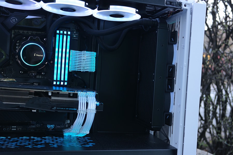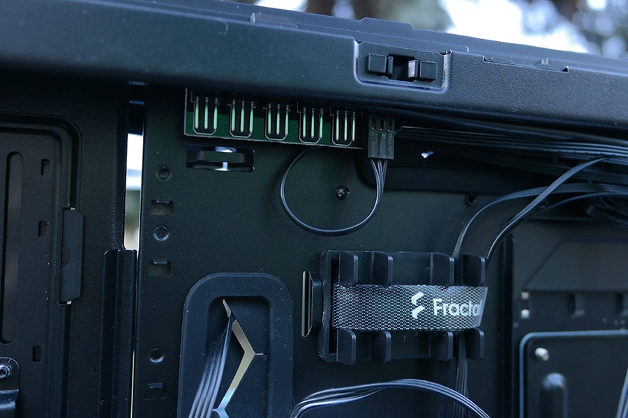 Kõrval märkusena võib mainida, et tagumise 120 mm ventilaatori paigutamisel ei ole seda võimalik liigutada üles ja all, millest tulenevalt ei oleks Fractal pidanud tegema piklikud augud ventilaatori kinnitamiseks vaid oleks lihtsalt pääsenud tavaliste ümmarguste aukudega – samaks kui meie ei leia kaustust ei tähenda, et keegi teine ei leia. Rääkides ventilaatoritest, siis radiaatorite togi on meie meelest suurepärane võimaldades pea et igasuguseid seadistusi. Küll peab arvestama end radiaator on suurem kui seda jahutvad ventilaatorid, kuna radiaatori ühes otsas paikneb vee paak, mille külge kinnituvad jälle torude üleminekud, millega tuleb lihtsalt arvestada.