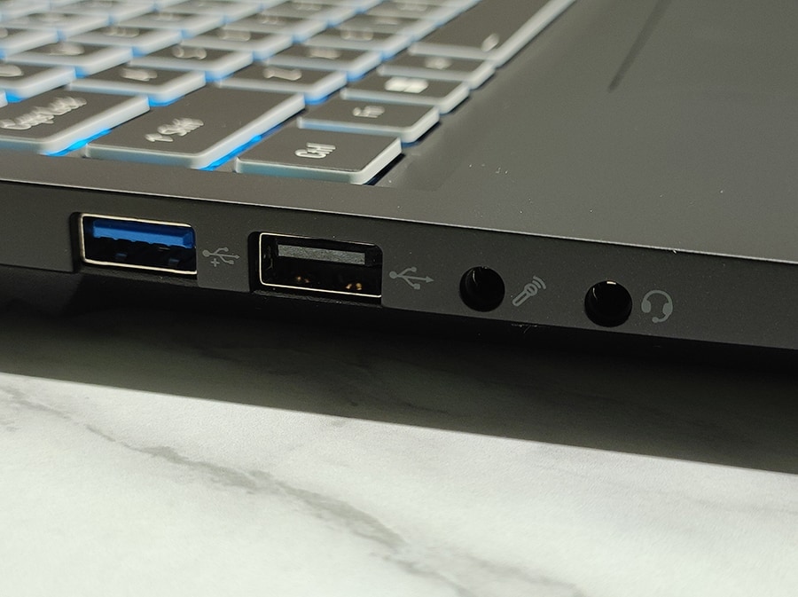 Gigabyte G6 KF pakub suure plusspunktina väga mitmekülgset portide valikut nii vasakul, paremal kui ka tagumisel küljel. Vasakul küljel asuvad kaks USB Type-A porti: üks USB 3.2 Gen 1 ja üks USB 2.0. Lisaks on seal kaks 3,5 mm audio pesa: üks kõrvaklappide ja üks mikrofoni jaoks.