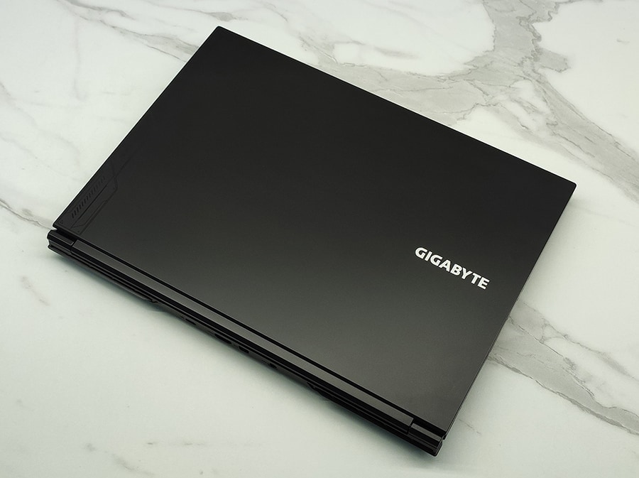 Gigabyte G6 KF on olemuselt suunatud küll mänguritele, kuid võrreldes näiteks enamike ASUS ROG sülearvutitega, on G6 välimuselt väga minimalistlik ja praktiline. Sülearvuti korpus on valmistatud mustast plastikust ning omab vaid Gigabyte’i logot ja vaevumärgatavat disainielementi vasakus nurgas.