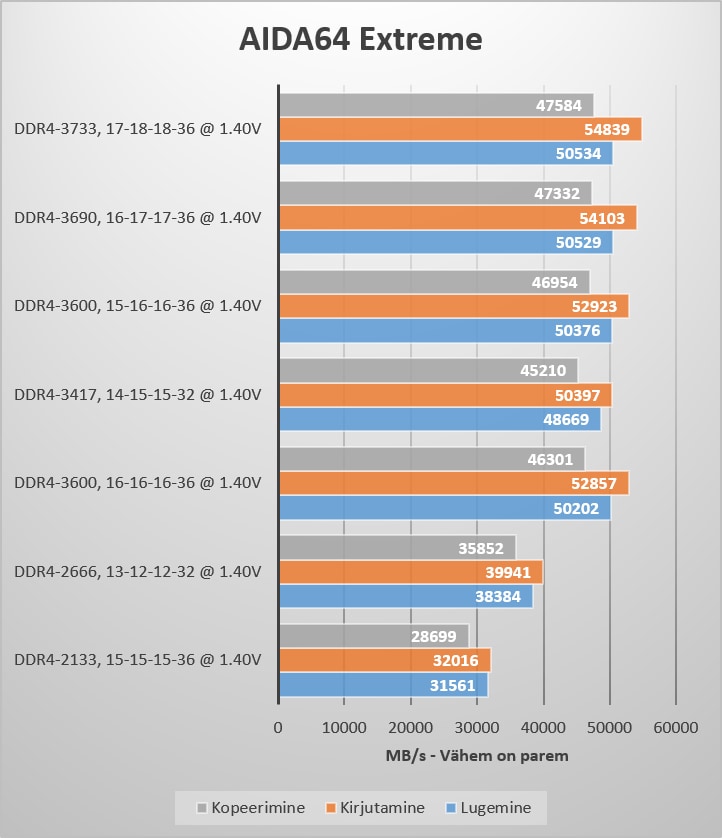 Testimise käigus sai jooksutatud nelja testi: mälust - lugemine, kirjutamine, kopeerimine ja latency. Tulemuseks kujunes viie testi keskmise põhjal.